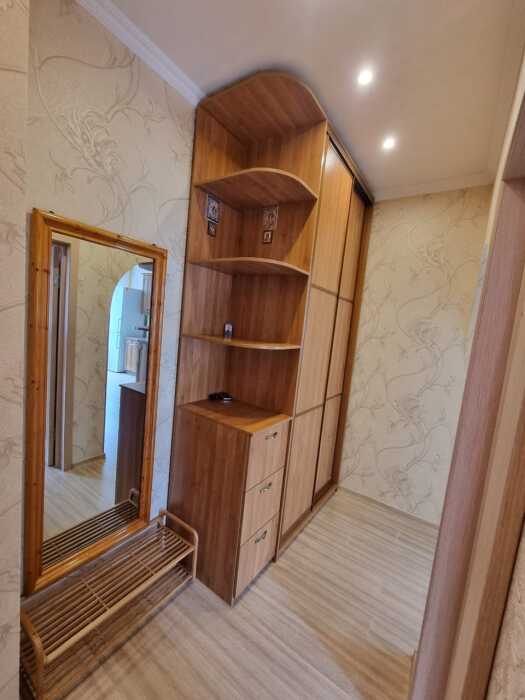 В прихожей есть шкафы для одежды, полка для обуви, зеркало.