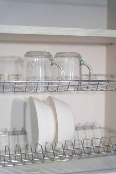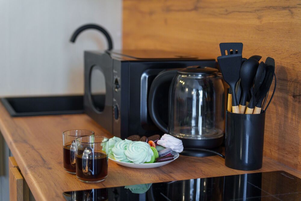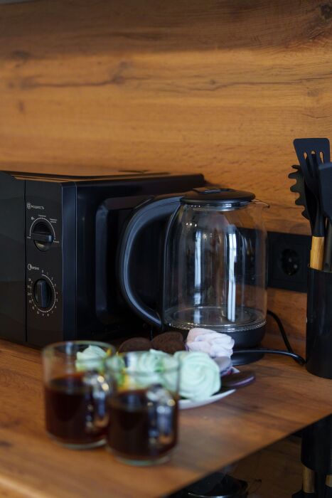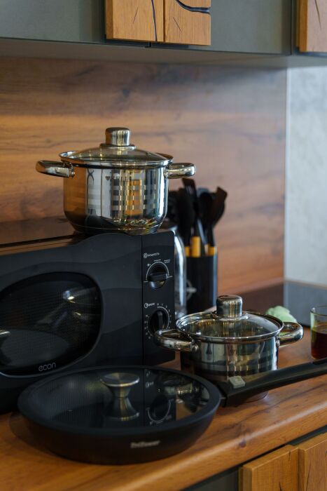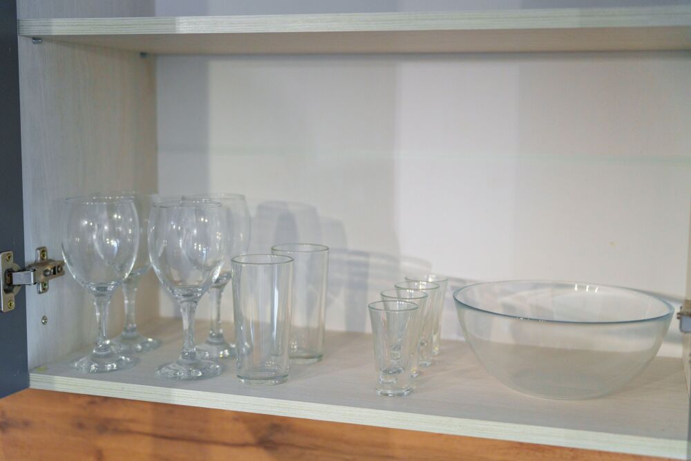 - Полный комплект посуды, кухонных принадлежностей и бытовой техники.