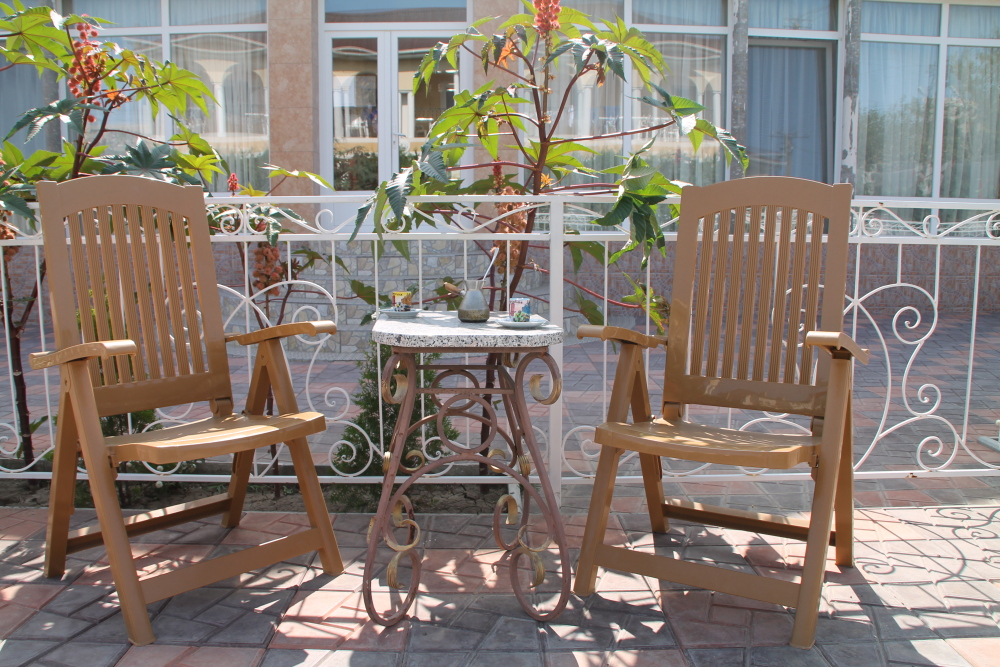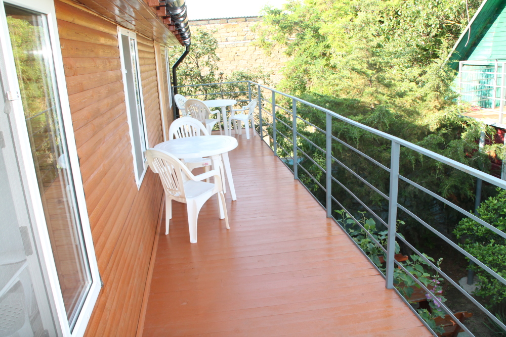 кондиционер. Чайный набор. В каждом номере санузел с душевой кабиной и феном. На балконе стол, стулья. Вид на сад.