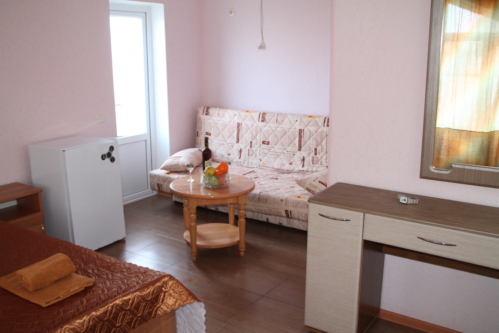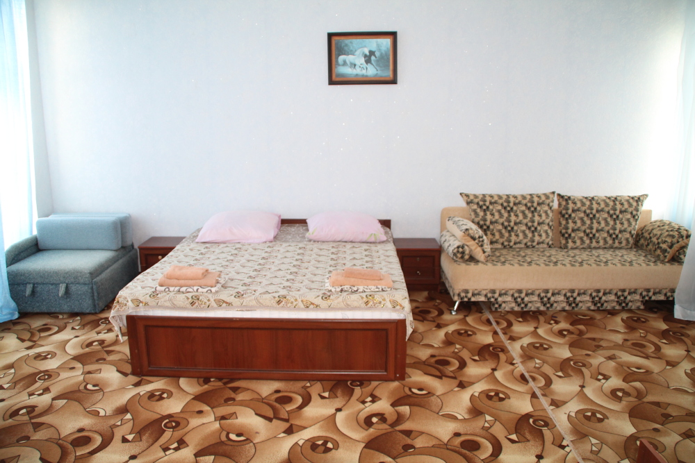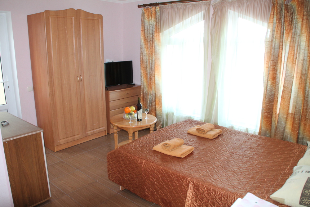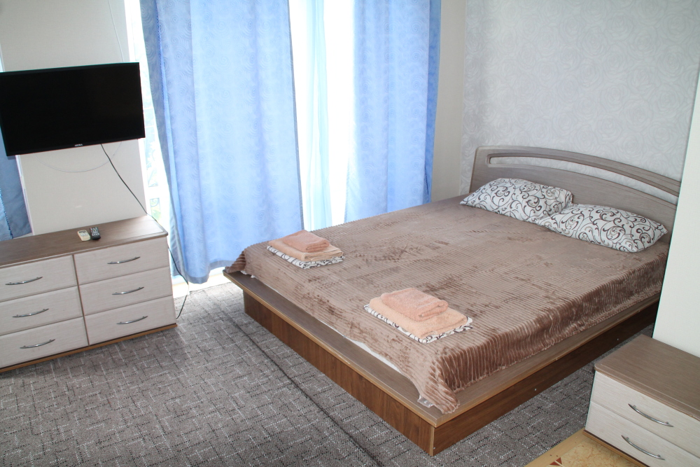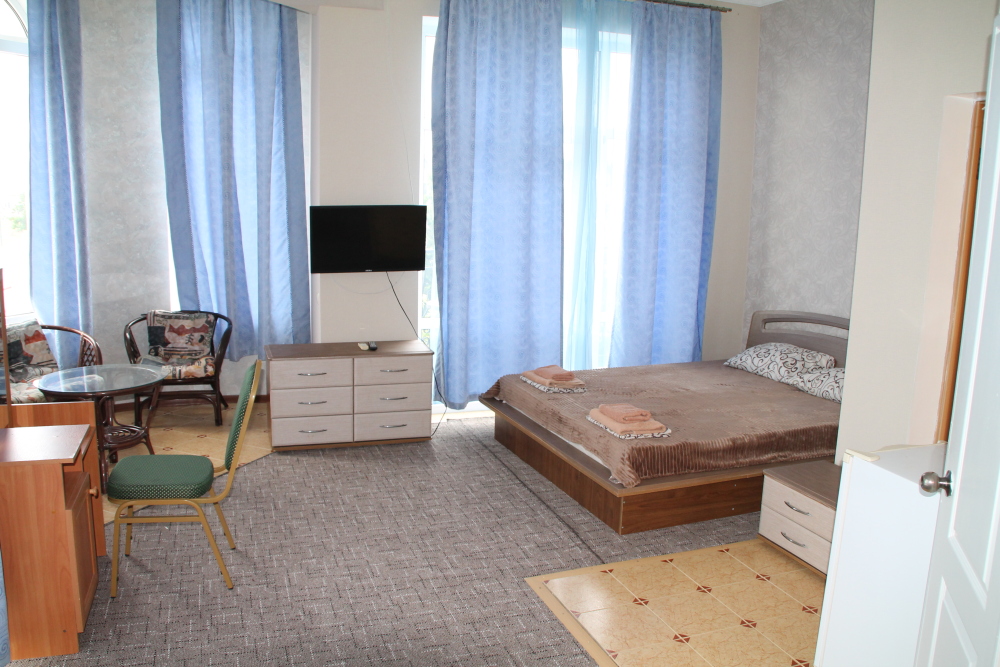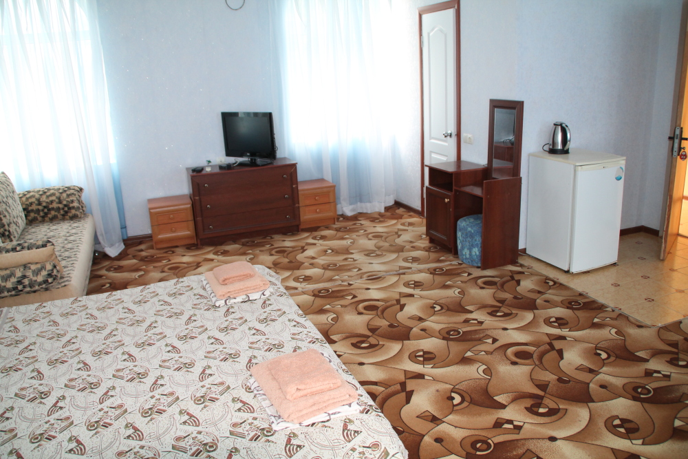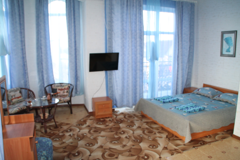 Номер в 2-этажном корпусе «Карина». Однокомнатный 30 м2 + балкон с видом на море . Рассчитан на 2 гостей. Допускается 1-2 доп. места. В Номере двухспальная 160х200 кровать, раскладной диван 160х200 или односпальная кровать 90х200. Шкаф, тумбочки, комод, трюмо, столик, кресла,стулья, ТВ,