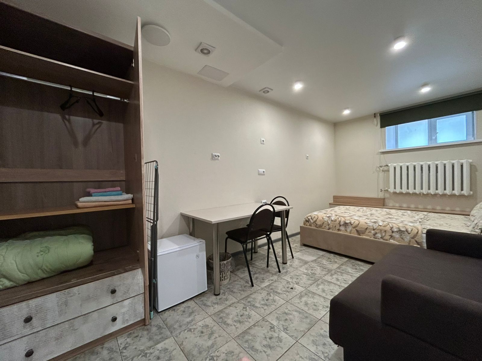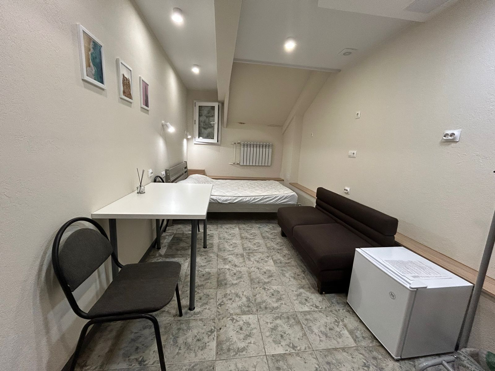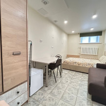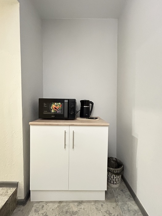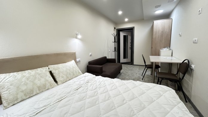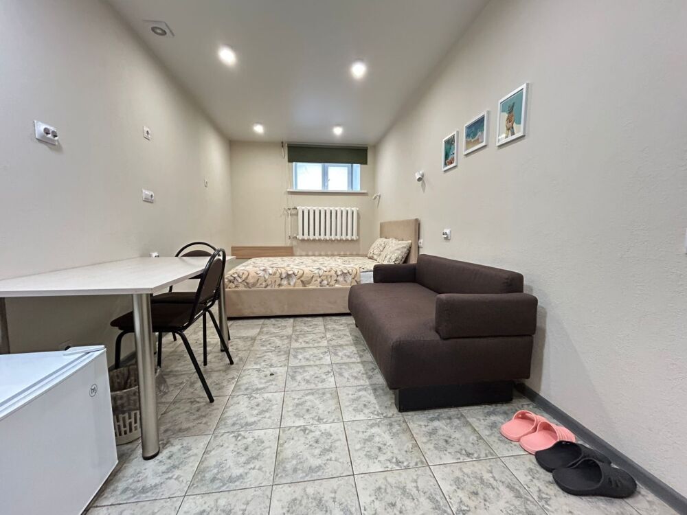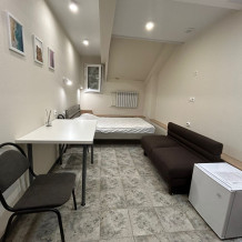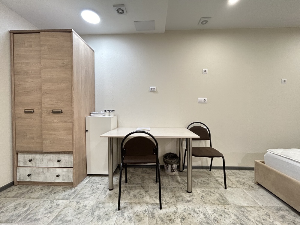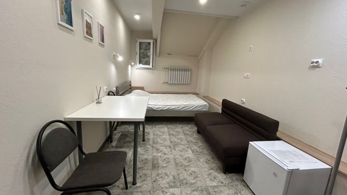 Номера занимают низкий первый этаж, при этом у нас высокие потолки и свежий ремонт. Комнаты стандарт пользуются общим санузлом и душем. Есть кухонный уголок, где можно разогреть готовую еду. Для проживания мы предоставляем постельное белье и полотенца.