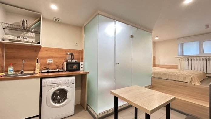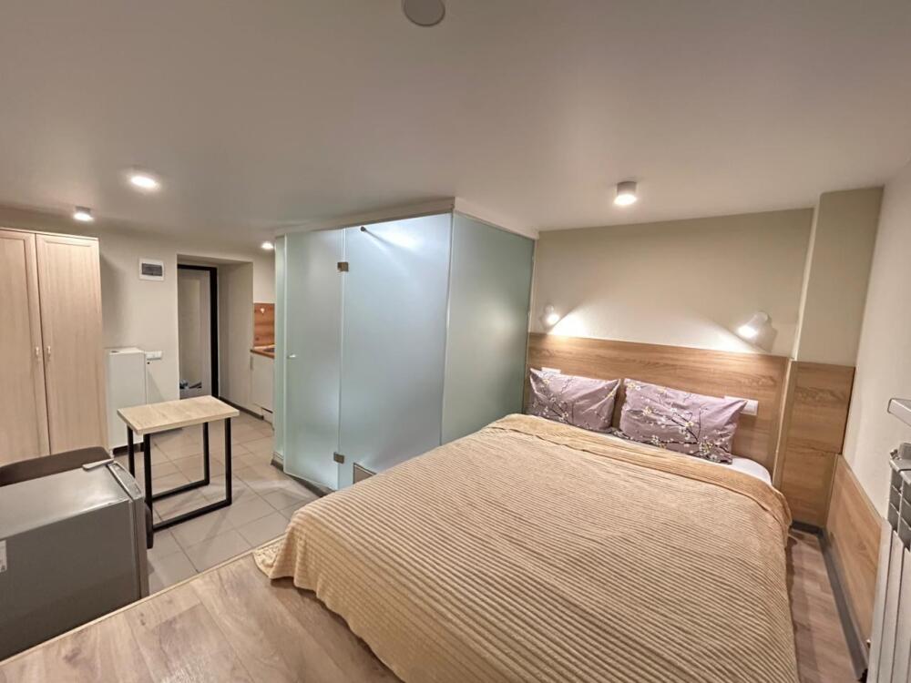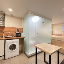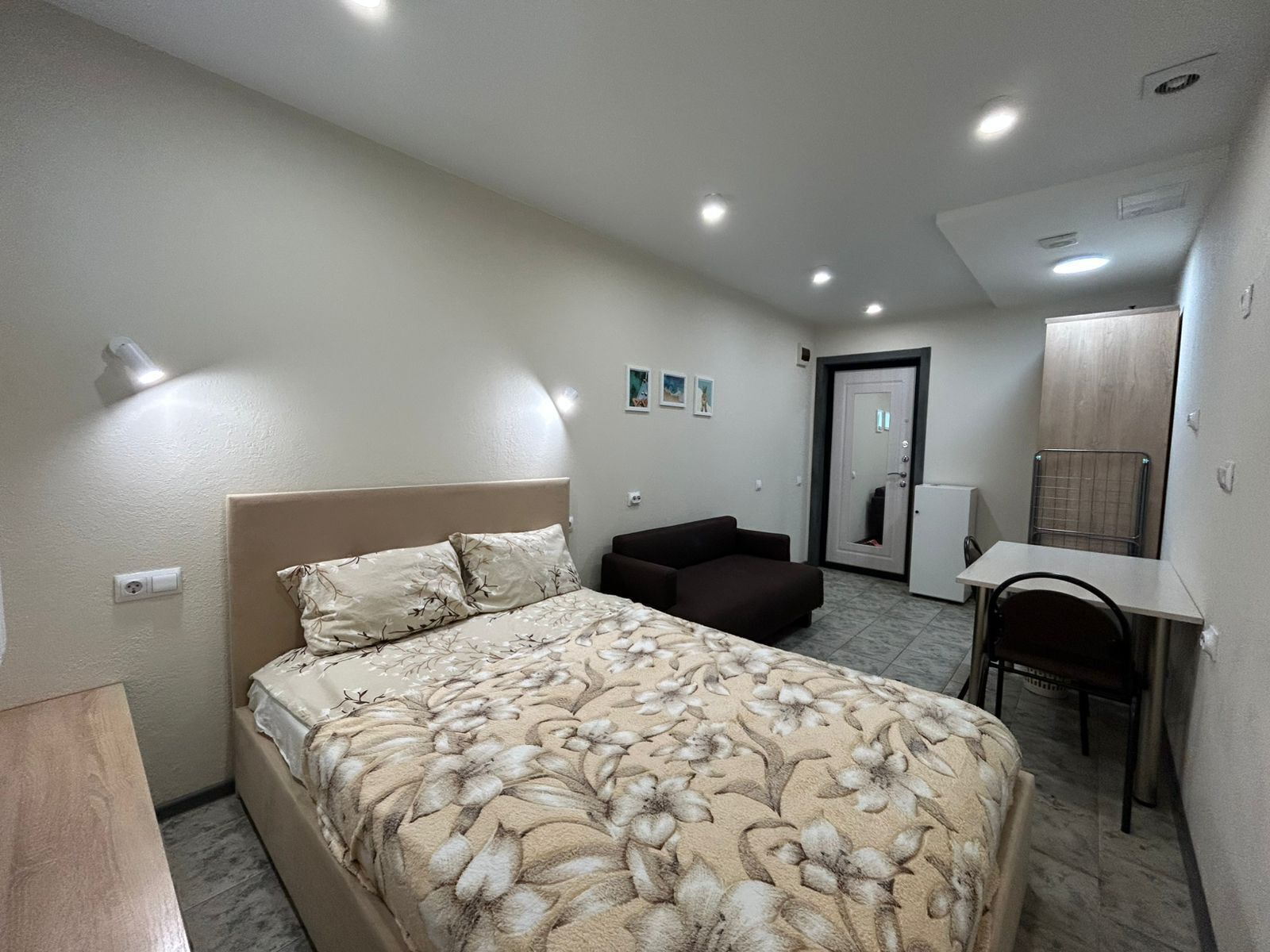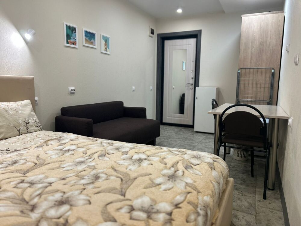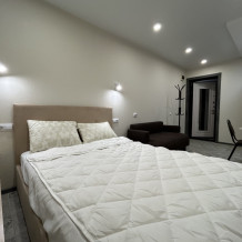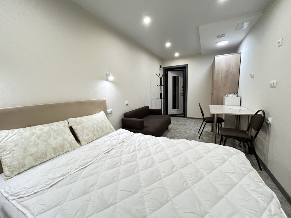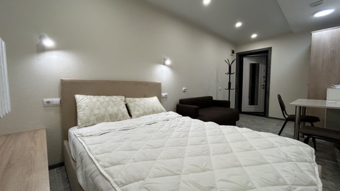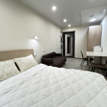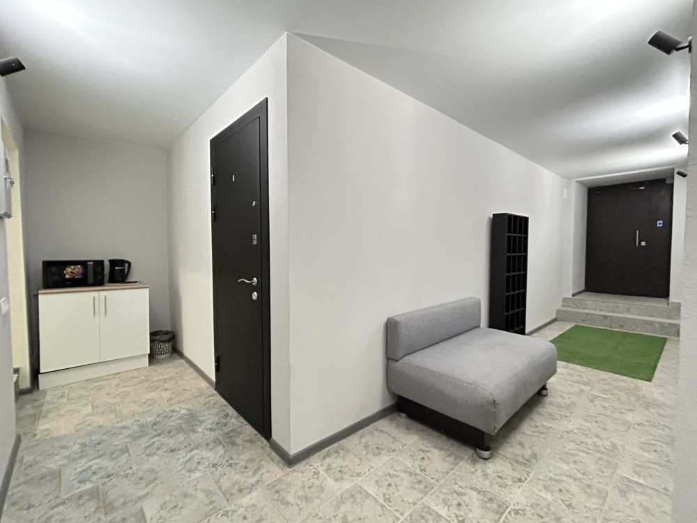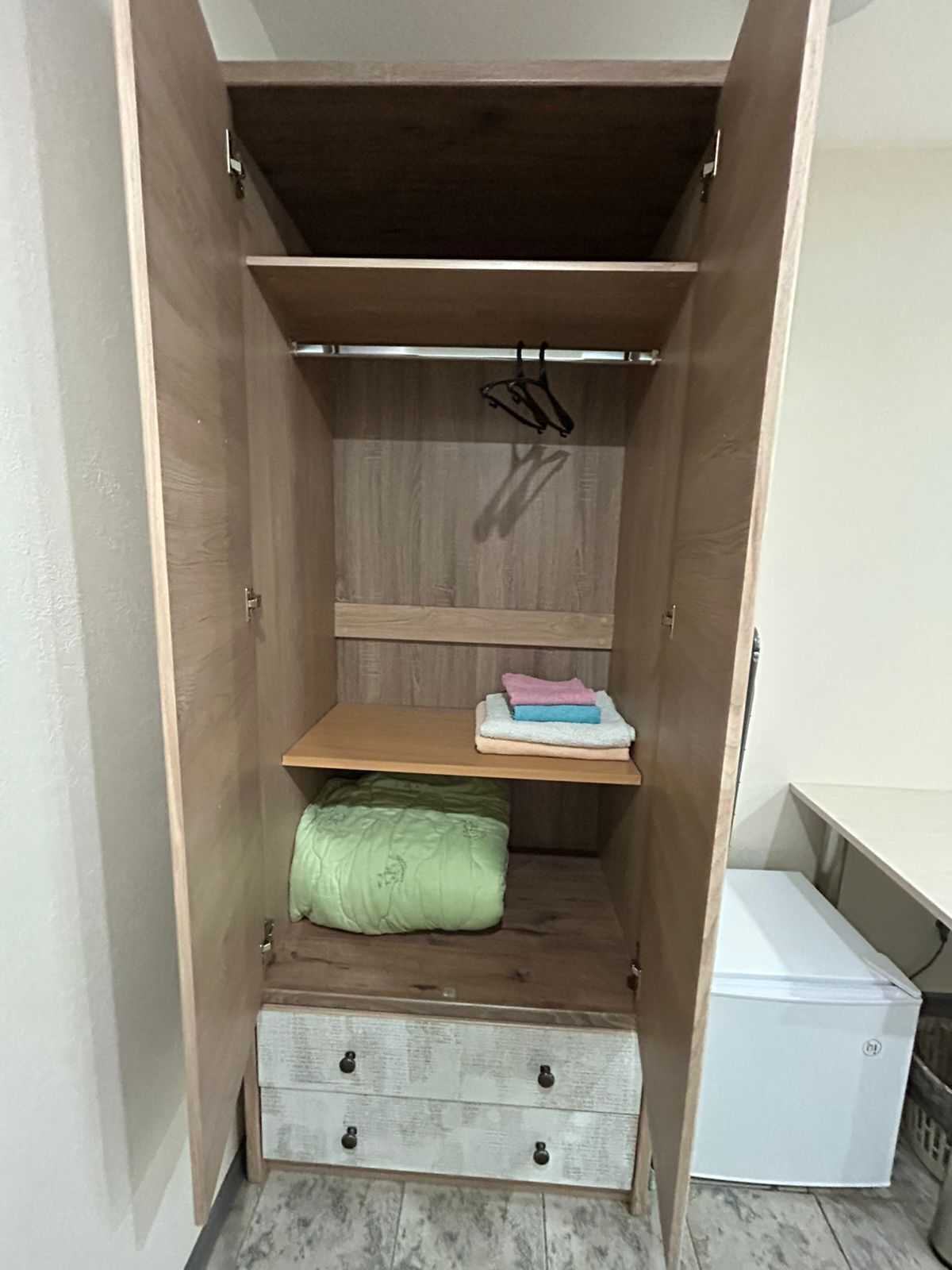 Номера занимают низкий первый этаж, при этом у нас высокие потолки и свежий ремонт. Комнаты стандарт пользуются общим санузлом и душем. Есть кухонный уголок, где можно разогреть готовую еду. Для проживания мы предоставляем постельное белье и полотенца.