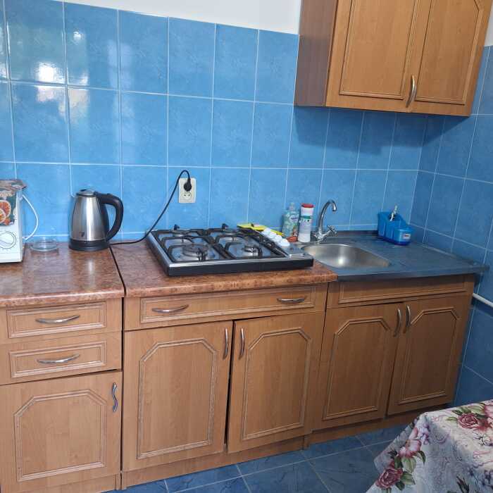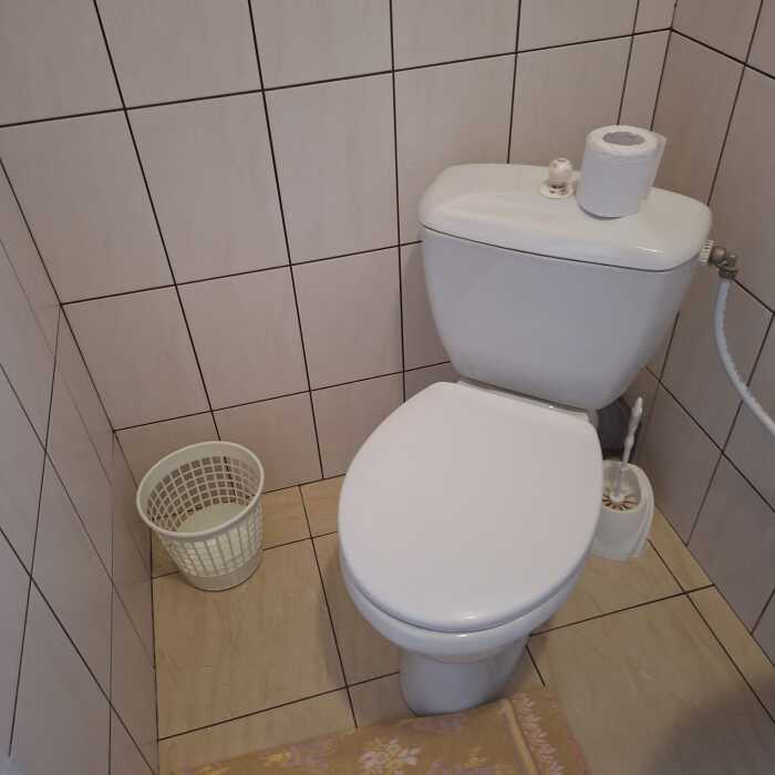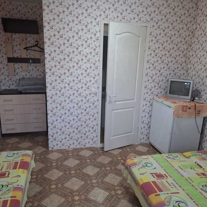 В доме 3 комнаты, одна 2-местная и две 3-местные. В каждой есть санузел, холодильник, телевизор, кондиционер, шкаф для одежды, интернет. Кухня находится рядом. На кухне есть вся необходимая посуда, кастрюли, сковородки, шампура, электрочайник, микроволновка, газовая плита.