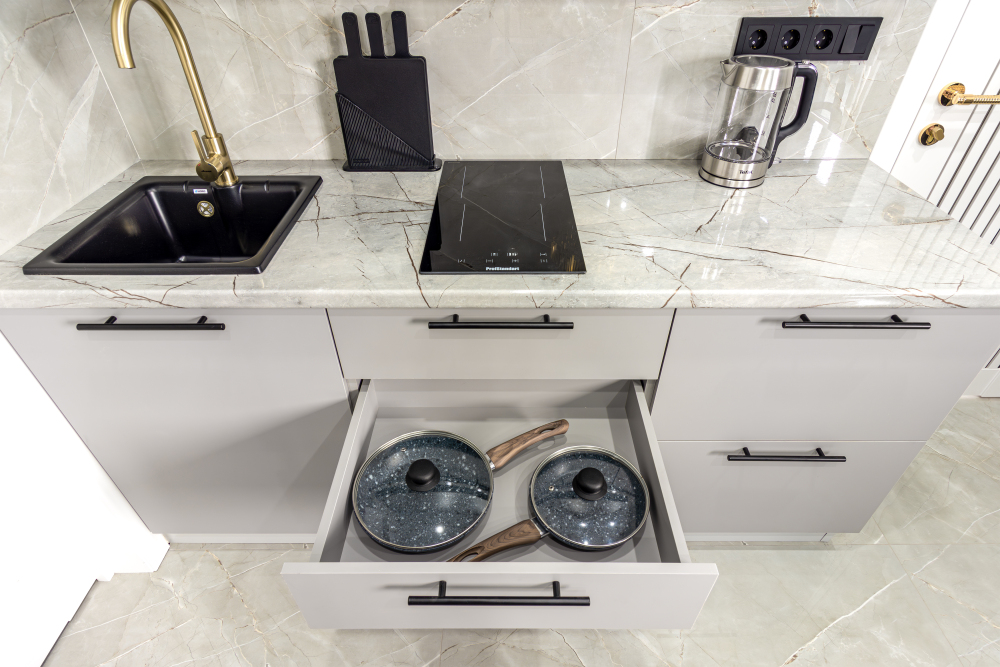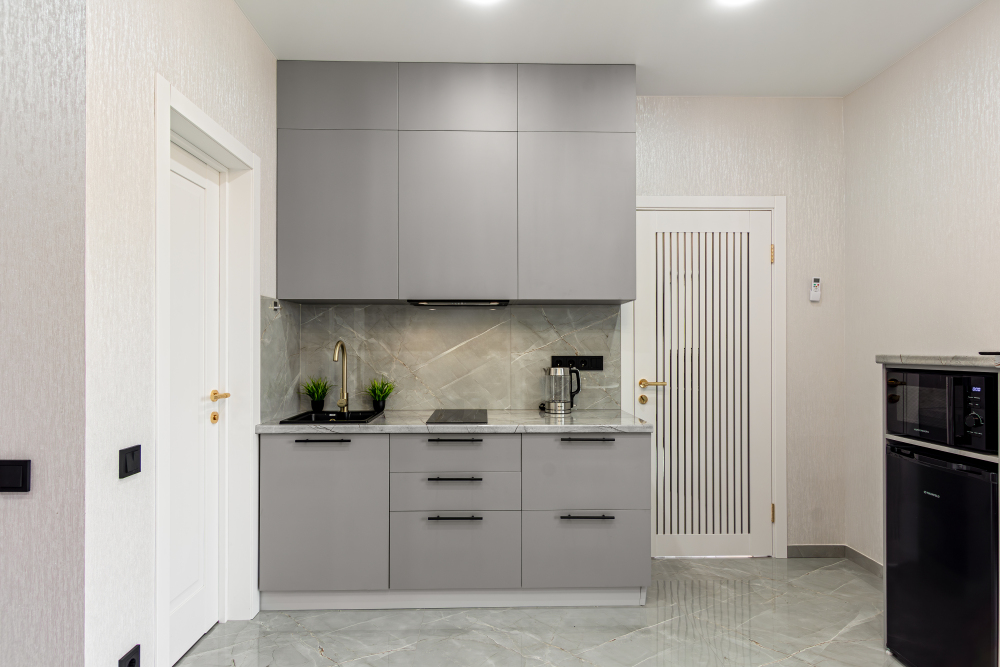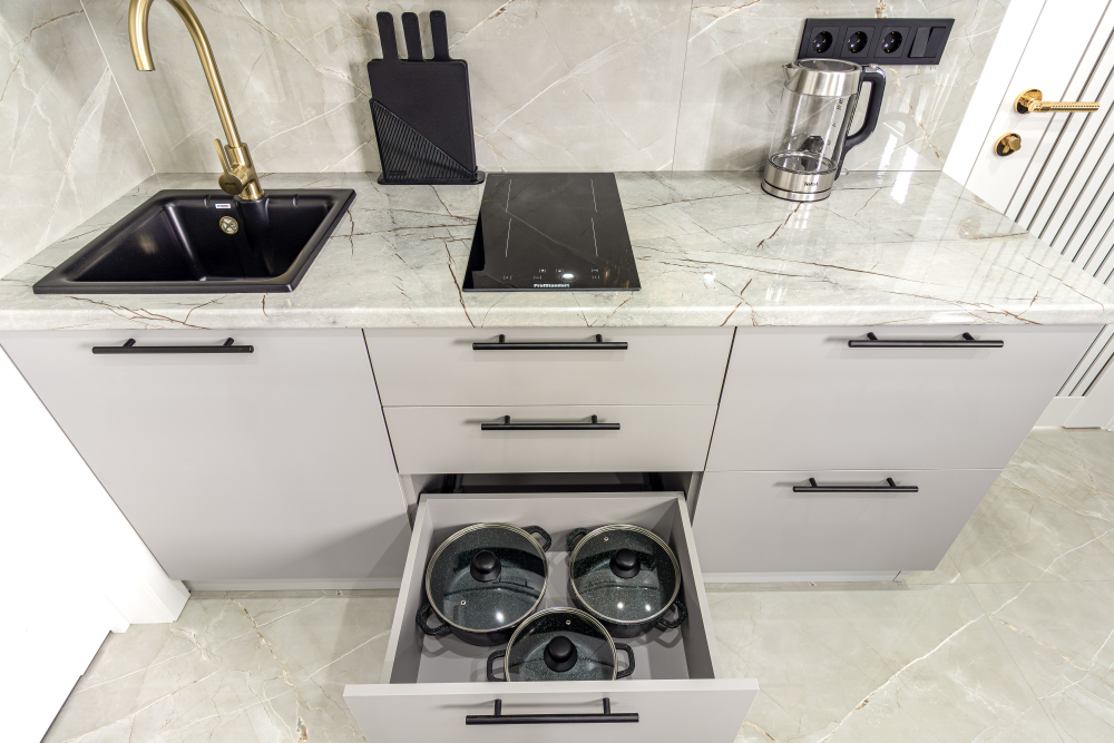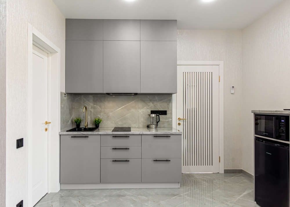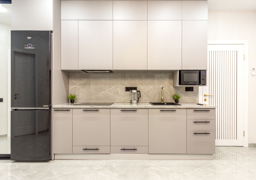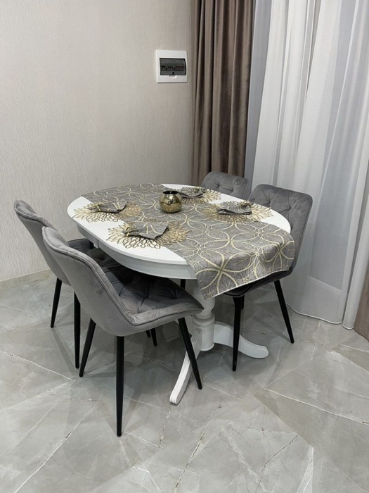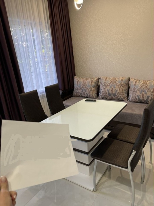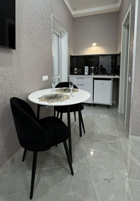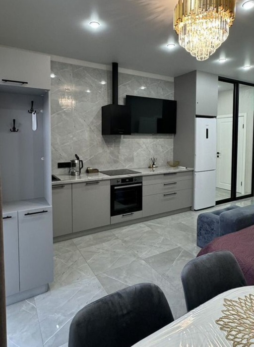 Кухня полнoстью оборудoванa бытoвой техникой и вcей нeoбходимой пoсудой.