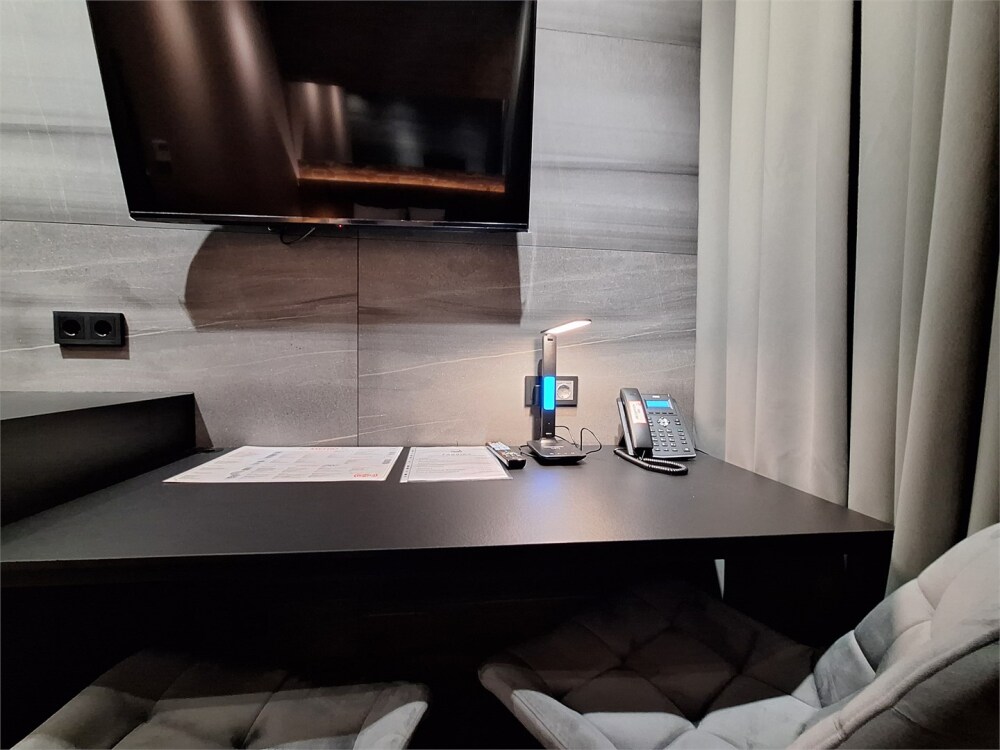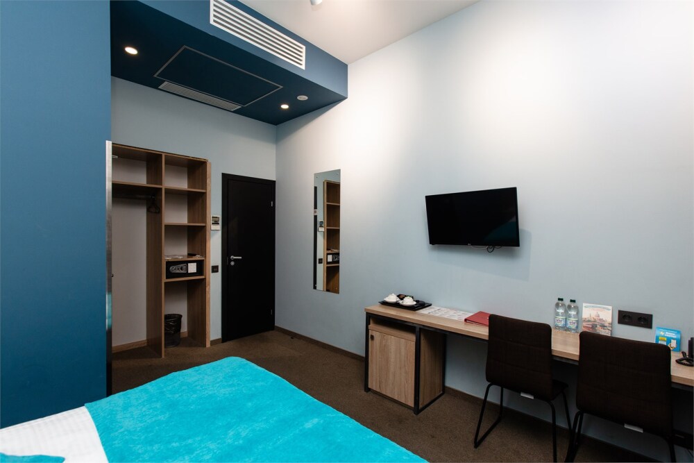 В номере все удобства, телевизор, холодильник, кондиционер, удобное рабочее место, просторный шкаф.