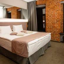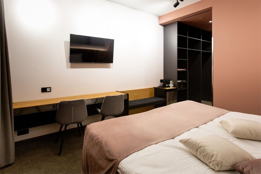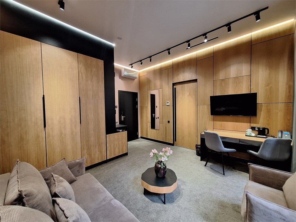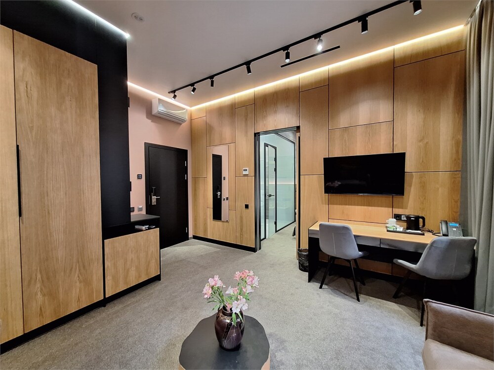 Люкс располагает современным оборудованием: телевизор с плоским экраном, бесплатный Wi-Fi и мини-бар создадут все условия для вашего комфортного проживания. Просторная ванная комната, укомплектованная качественной сантехникой.