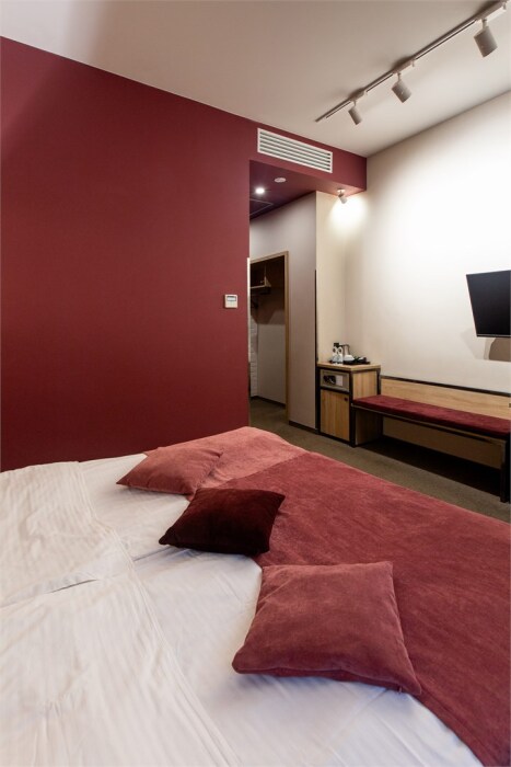 В номере гостевая зона, широкая двуспальная или две раздельные кровати. В номере все удобства, телевизор, холодильник, кондиционер, удобное рабочее место, просторный шкаф. В каждом номере для комфорта гостей расположена чайная станция.