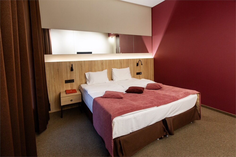 Стандартный номер для двоих гостей есть с двумя раздельными и с одной большой кроватью.