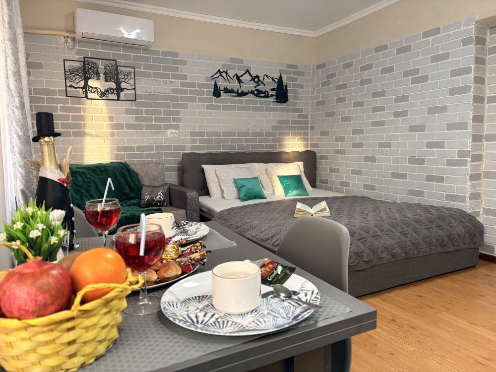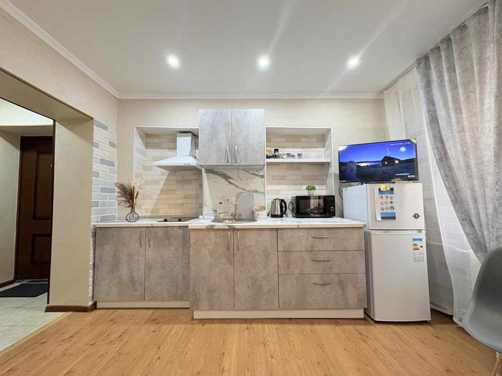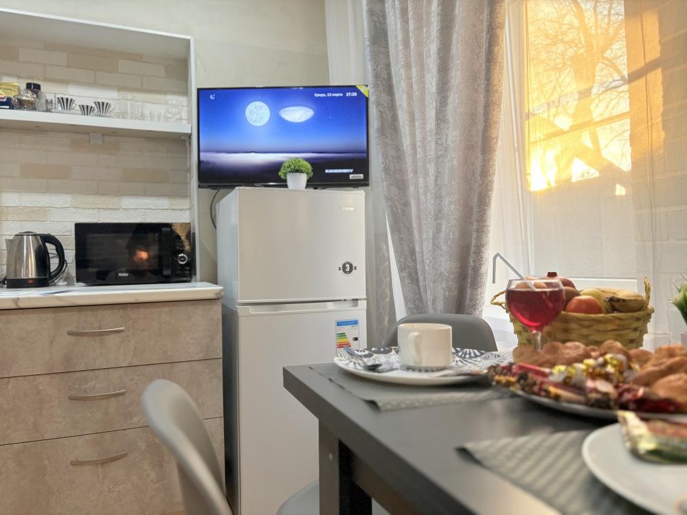 Чистое постельное белье, кровать, кондиционер, Wi-Fi, средства гигиены, холодильник, плита, микроволновая печь, стиральная машина, посуда, утюг, фен, гладильная доска.