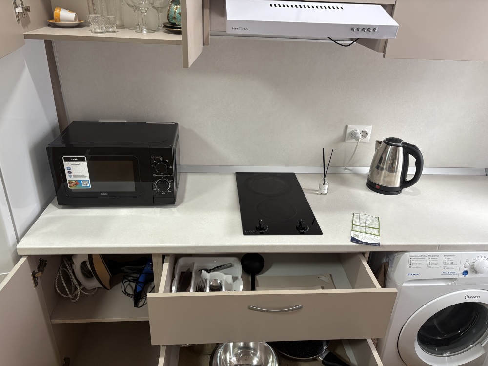 Чайник, необходимая посуда, средства гигиены (шампунь, гель.).