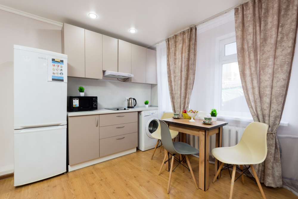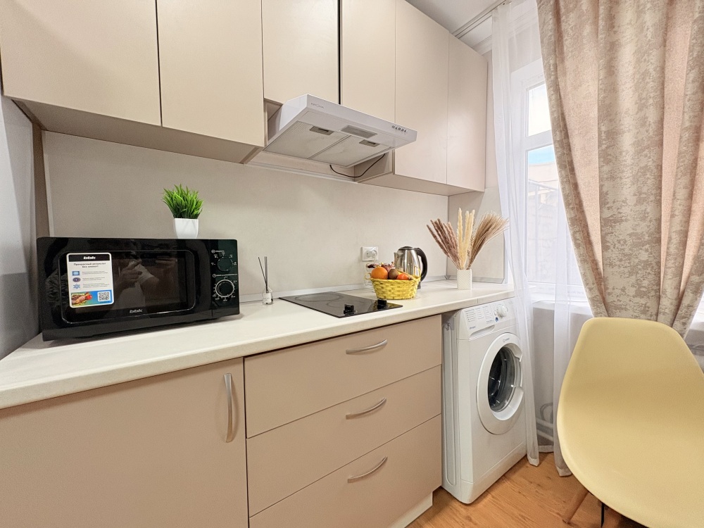 Телевизор, холодильник, стиральная машина и микроволновая печь.