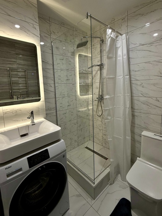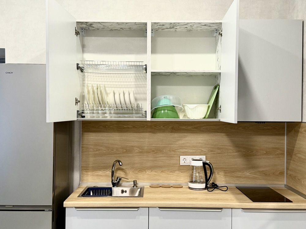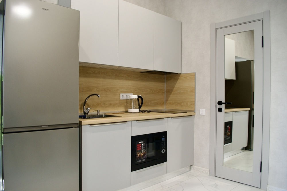 Главная изюминка этих апартаментов – полностью оборудованная кухня. Забудьте о походах в рестораны, если Вам захочется приготовить что-нибудь вкусное! В Вашем распоряжении современная плита для кулинарных экспериментов, холодильник для хранения продуктов и напитков, микроволновая печь для быстрого разогрева, чайник, набор посуды и кухонной утвари для приготовления любых блюд. Вы сможете наслаждаться завтраками, обедами и ужинами в уютной обстановке, не покидая апартаменты. Кроме того, в Вашем распоряжении собственная ванная комната с душем, полотенцами, феном и стиральной машинкой.