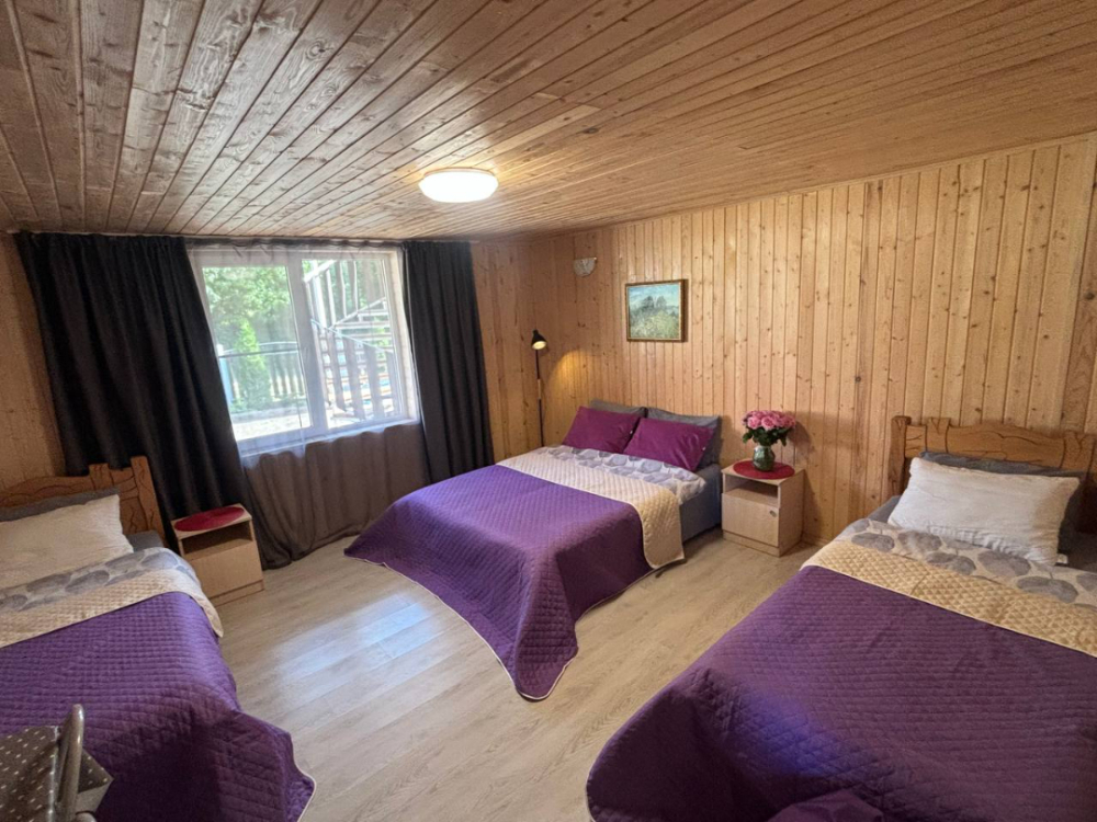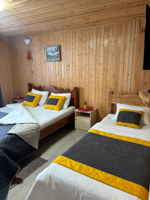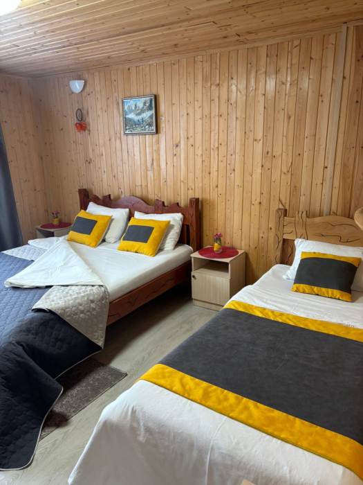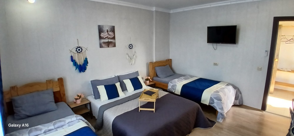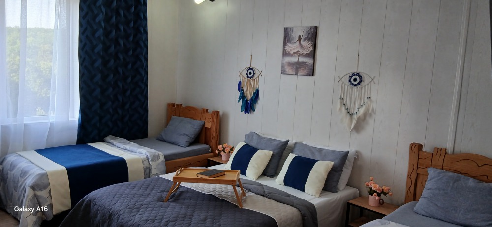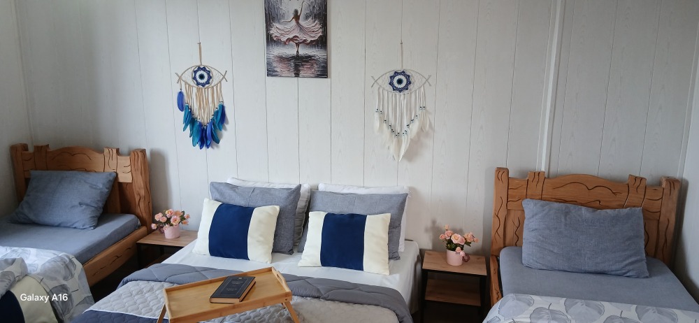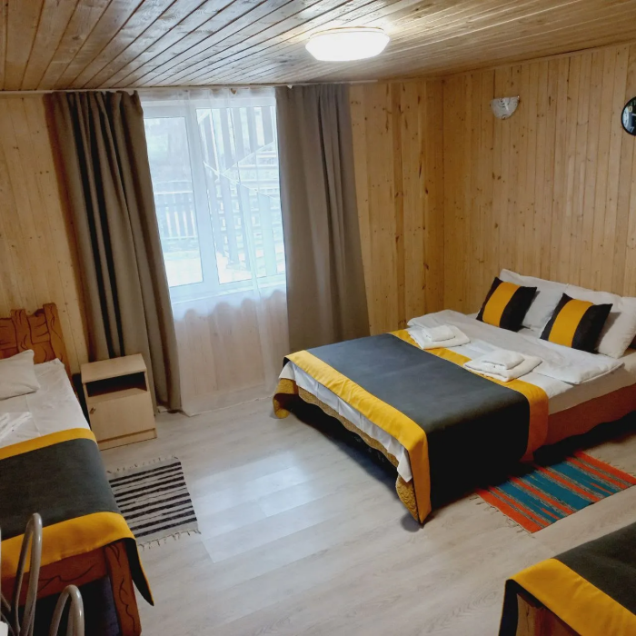Номер для 4-х человек. В нем расположено две односпальные кровати и двуспальная кровать. Бассейн и завтраки входят в стоимость.