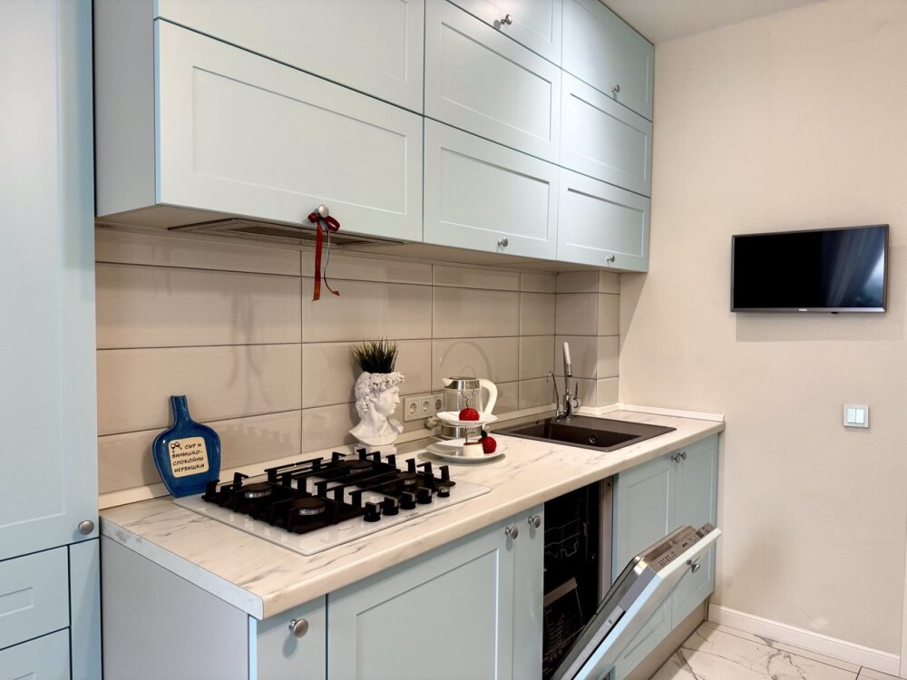- на кухне все необходимое для приготовления еды: посуда, столовые приборы, кастрюли и сковородки, микроволновка, холодильник, чайник, духовка, посудомойка и газовая плита.