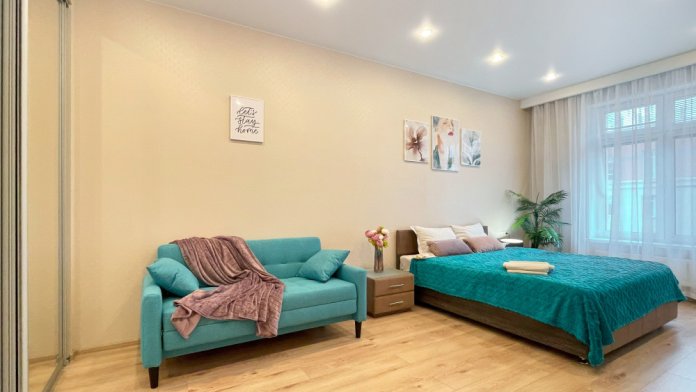 - Современная мебель - двуспальная кровать с удобным матрасам «Аскона» и два двуспальных дивана;