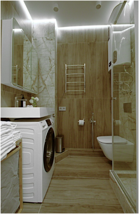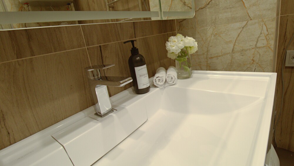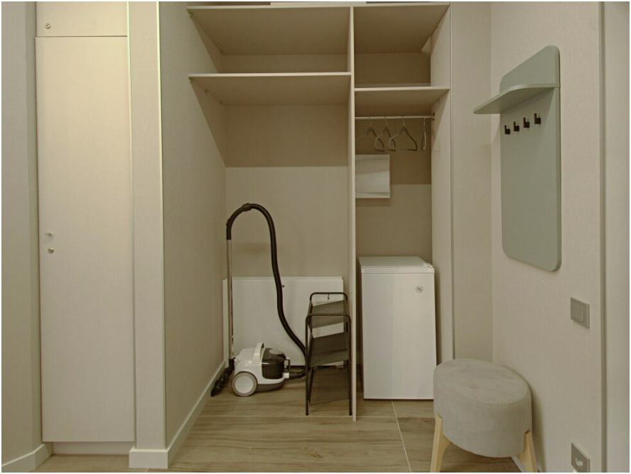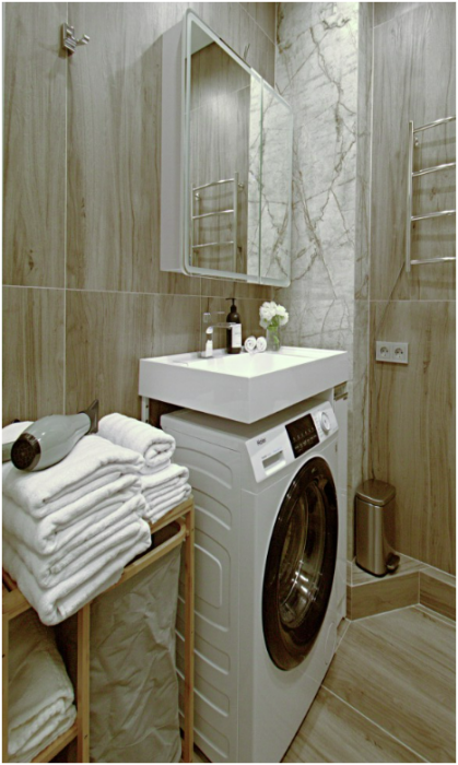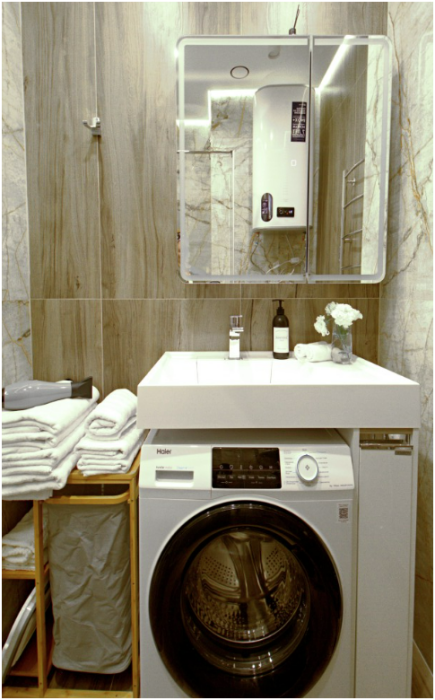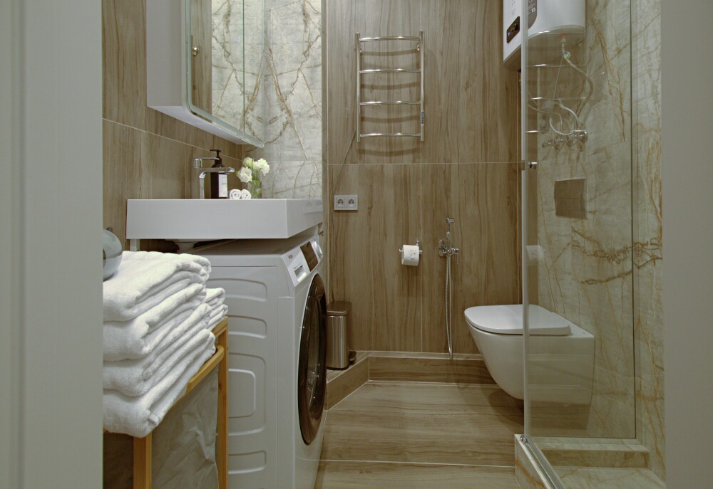 — Санузел: Стильный санузел с душевой кабиной, раковиной, зеркалом и феном. Стиральная машина, сушильная машина.