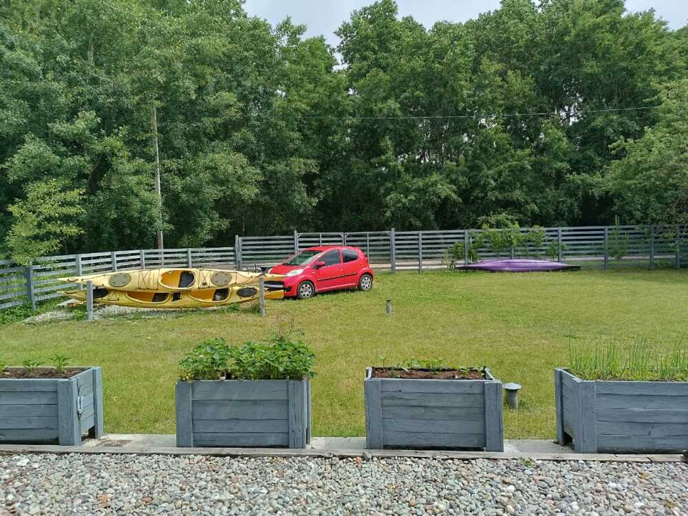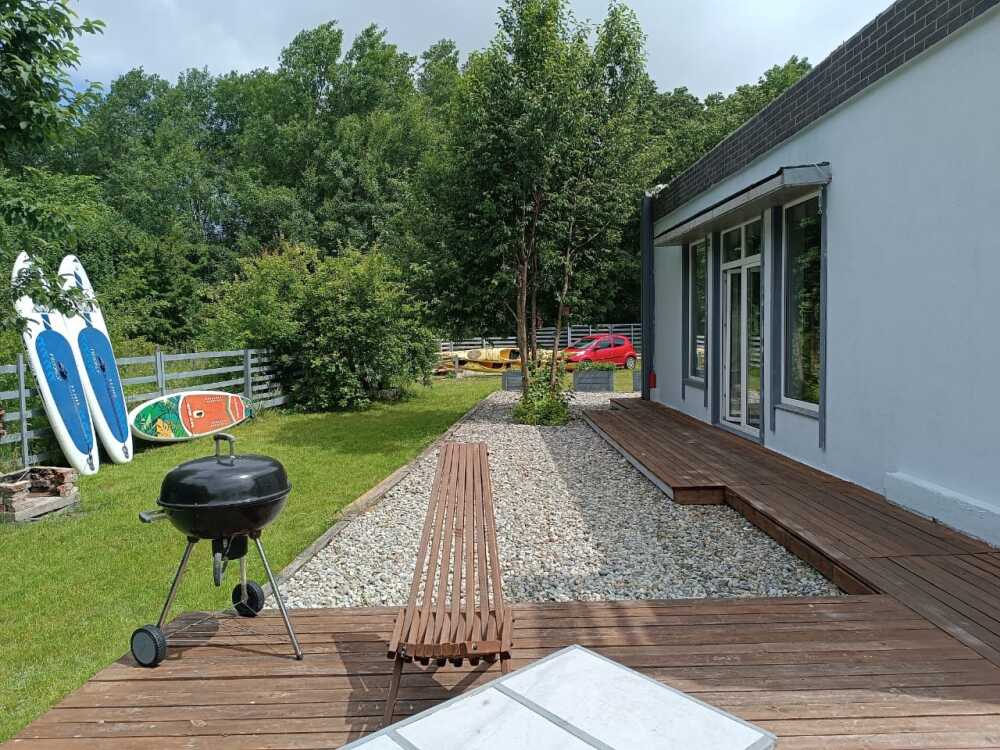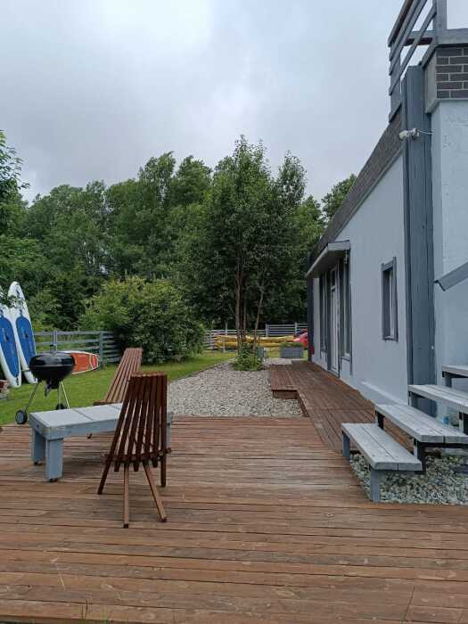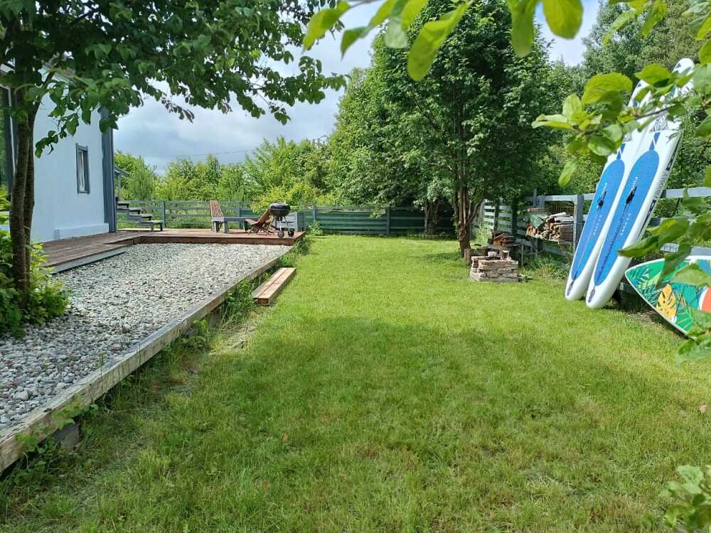 На территории участка нет ничего кроме газона и фруктовых деревьев, зоны хранения каяков и паркинга под три авто. На плоской крыши открытая площадка с уличной мебелью. Присутствует охранно-пожарная сигнализация, видеонаблюдение. Можно пользоваться каяками и сапбордами. Зона костра и готовки барбекю. Есть спиннинг для рыбалки, велосипед, коврики для занятия (йога, растяжки, зарядки) гимнастический мягкий шар. Детей можно занять игрушками, книжками. В детской гостевой - гамак.