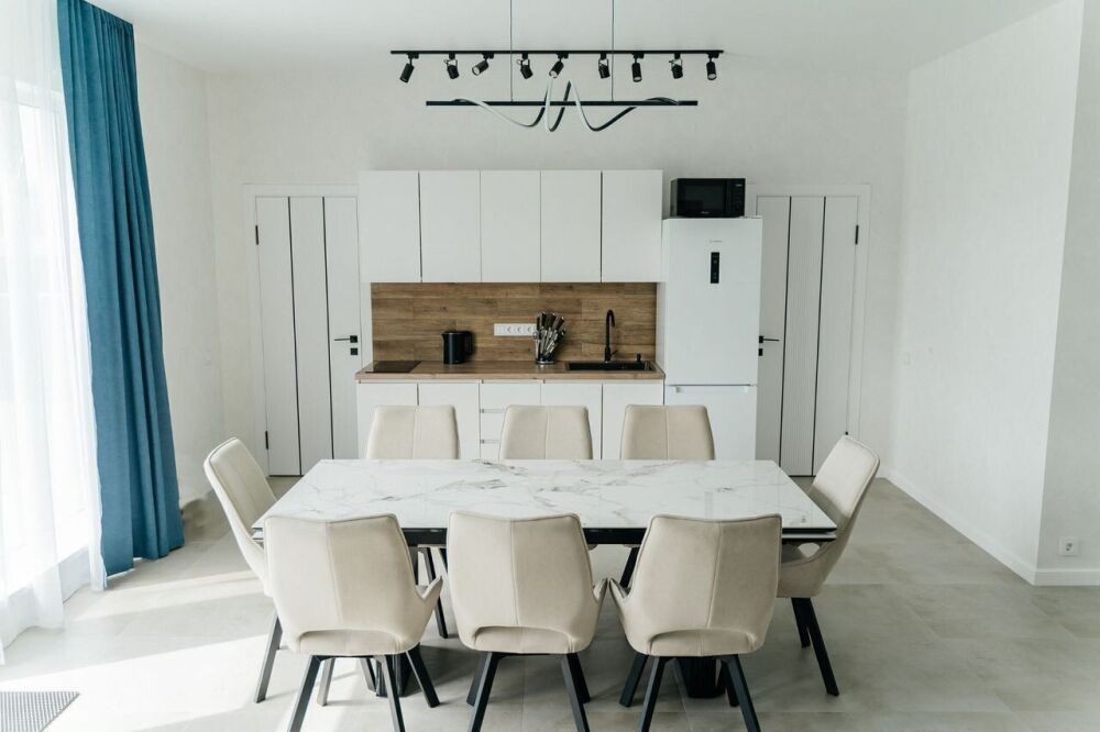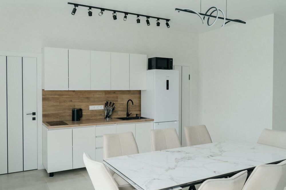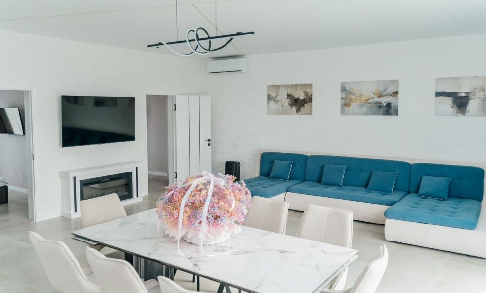 ️ - большая кухня, за керамическим столом в которой поместится вся компания, диван, телевизор, музыкальная колонка, камин.