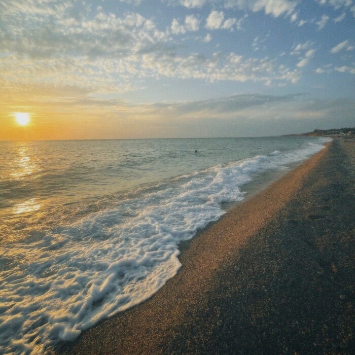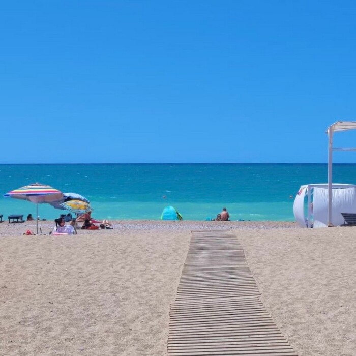 Широкий песчано-галечный пляж с кристально чистой водой, протяжённостью 2 км, оборудованный шезлонгами, навесами, детскими и спортивными площадками, бесплатной парковкой.