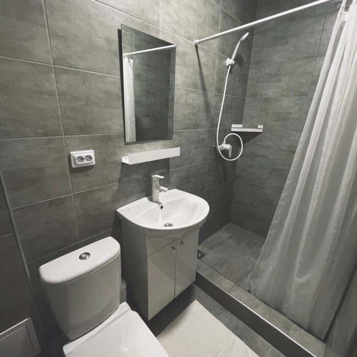 Индивидуальная ванная комната: душ, раковина, туалет.