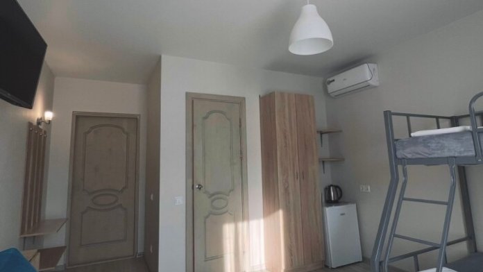 Имеется кондиционер, шкаф, вешалка, зеркало, обеденный стол, чайник, холодильник, стулья.
