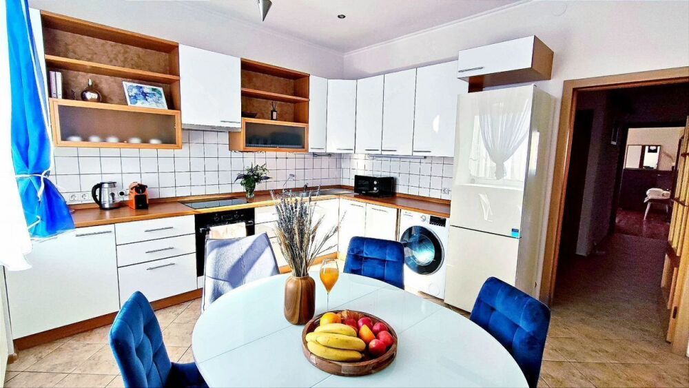 В квартире две большие изолированные спальни, гостиная с раскладывающимся двуспальным диваном, в отдельной гардеробной с окошком разместилась еще одна односпальная кровать, полностью оборудованная просторная кухня: холодильник, духовка, микроволновка, плита, посудомоечная машина, чайник, капсульная кофеварка и джезва для настоящих ценителей. Если решите готовить дома, есть вся необходимая посуда. Стиральная машина, гладильная доска и утюг готовы для Вас.
