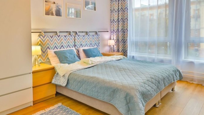 - в первой спальне двуспальная кровать 140х200см, платяной шкаф и дополнительное хранение в изголовье;