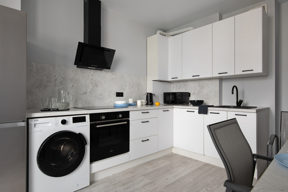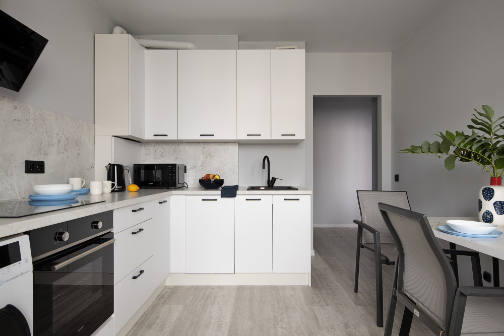 - Полностью оборудованная кухня: холодильник, плита, духовка, микроволновка, чайник.