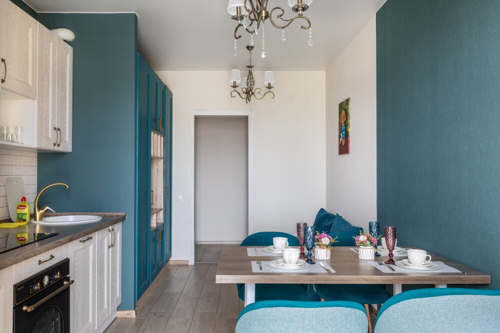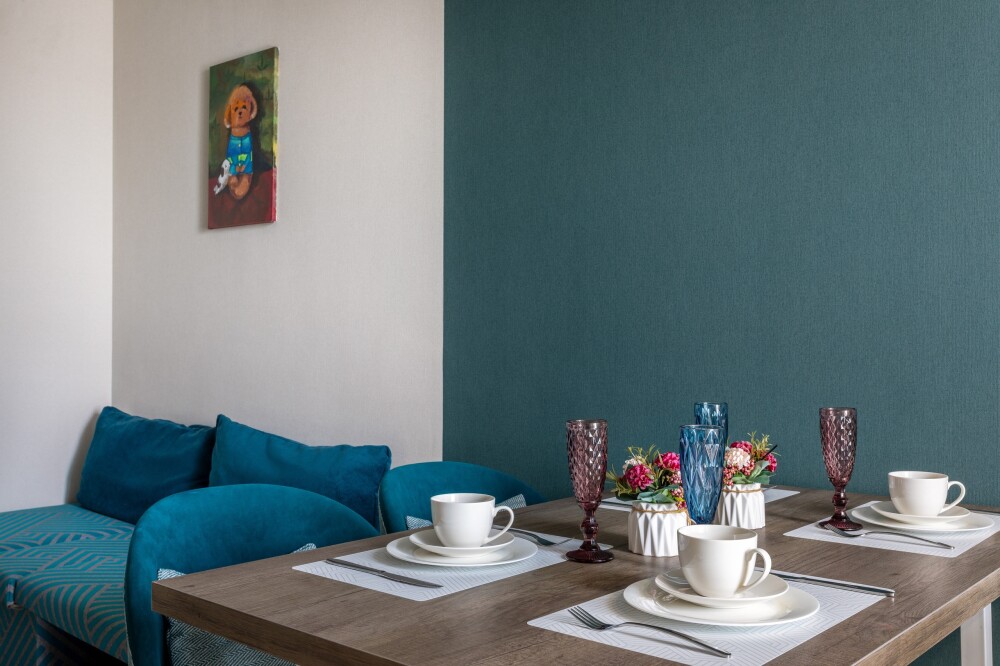 В квартире с комфортом могут разместиться до пяти человек: двуспальная кровать, диван-кровать и дополнительный диван.