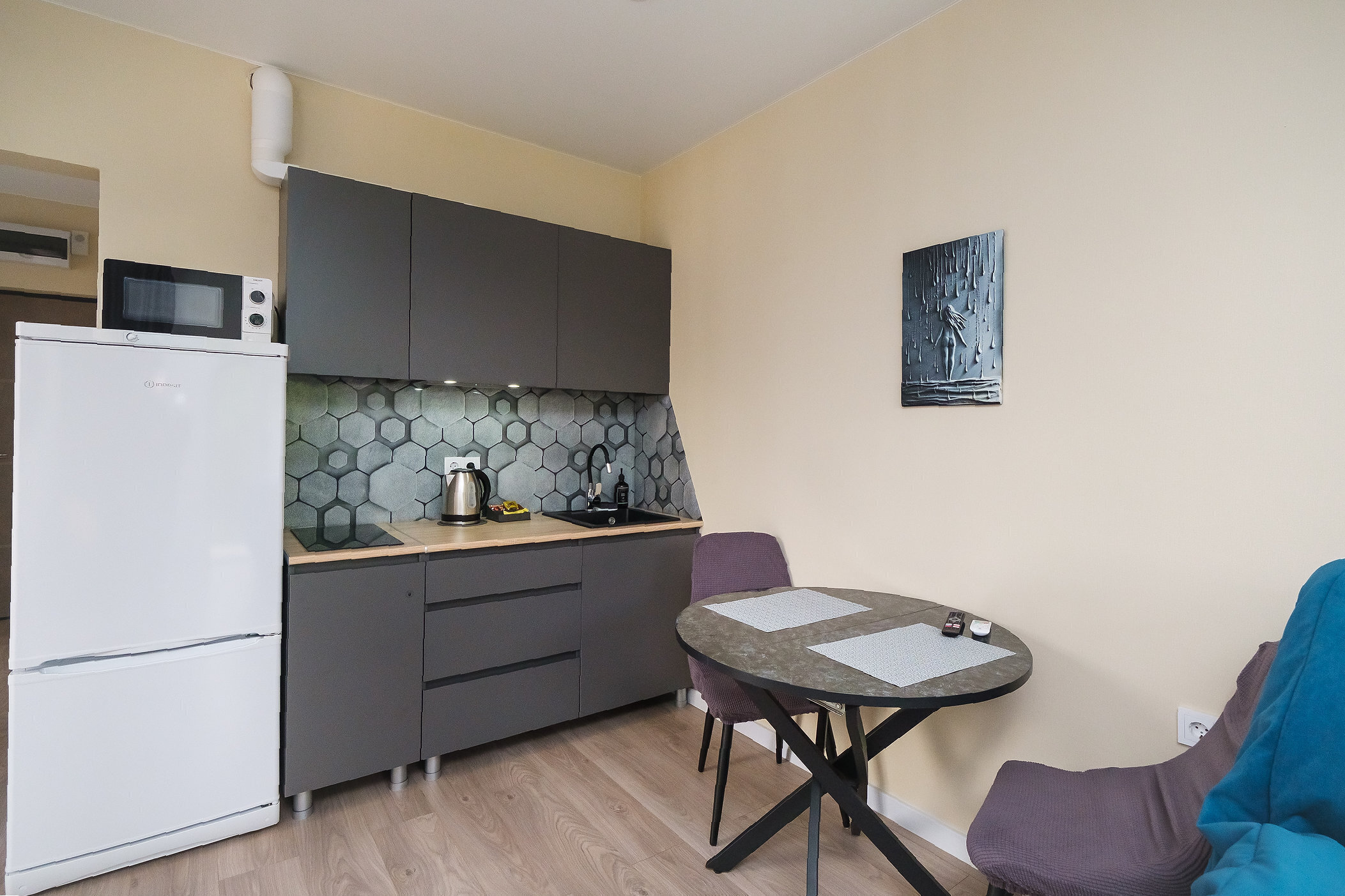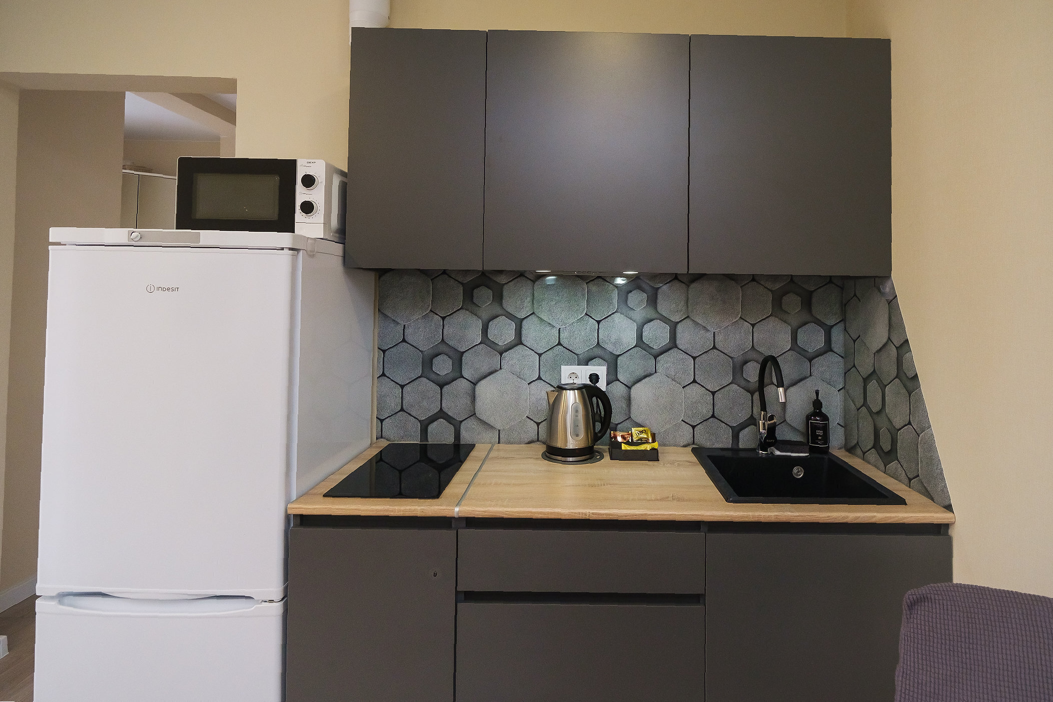 - Полностью оборудованная кухня (электрочайник, микроволновая печь, чай, кофе, питьевая вода)