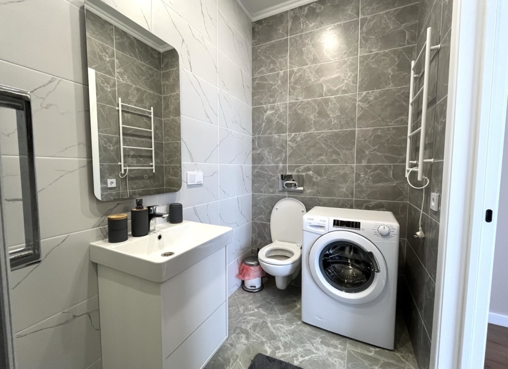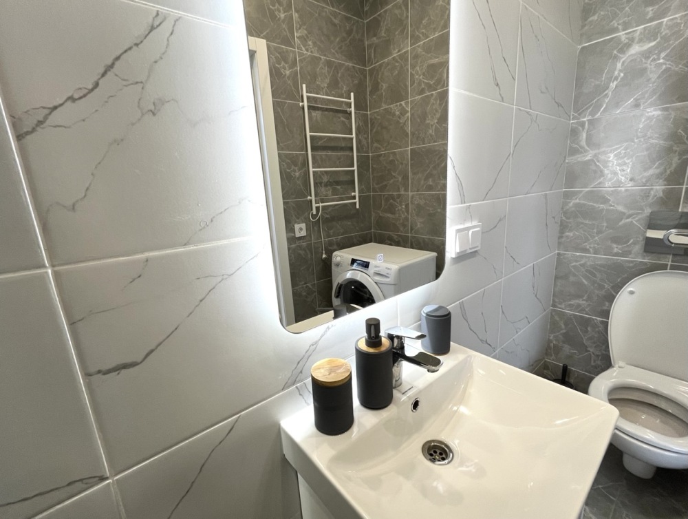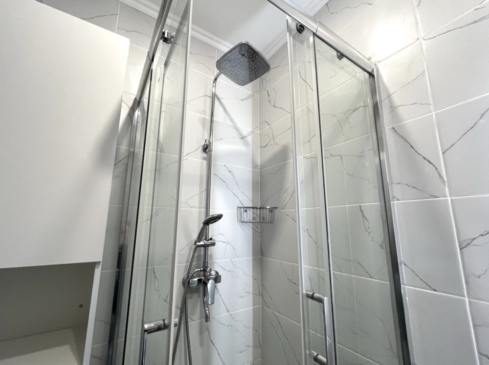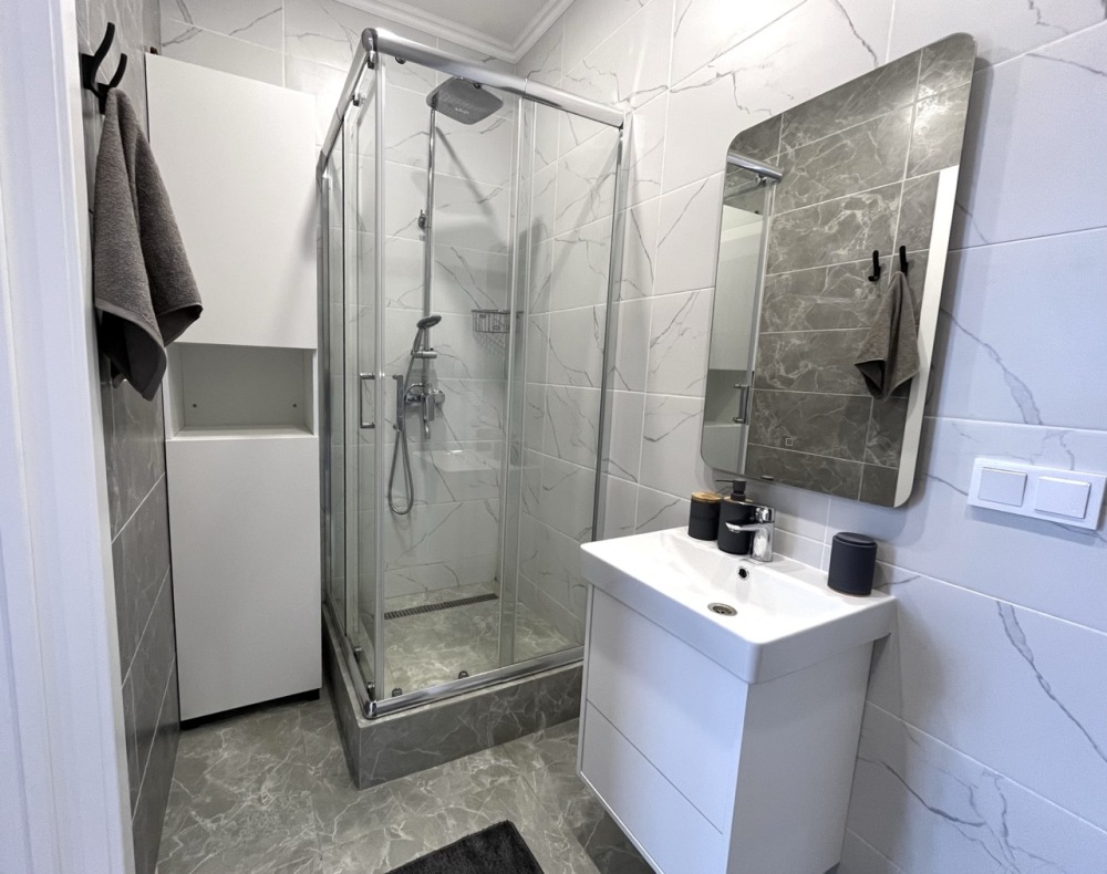 - Стильный санузел с душевой кабиной, теплым полом и полотенцесушителем.