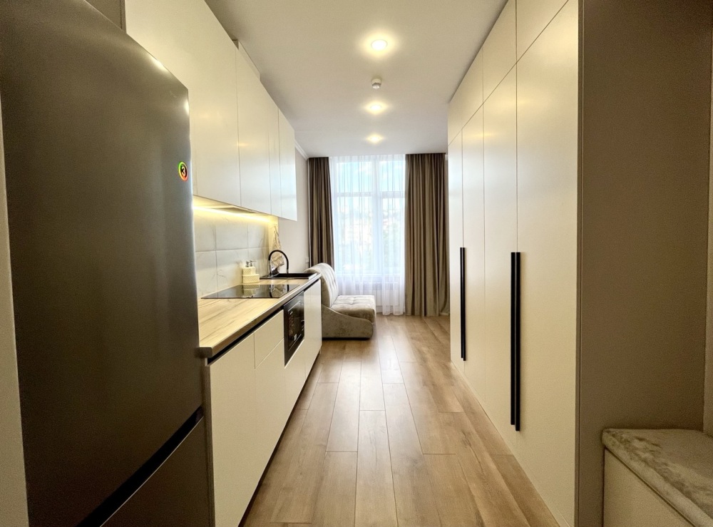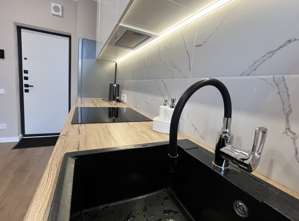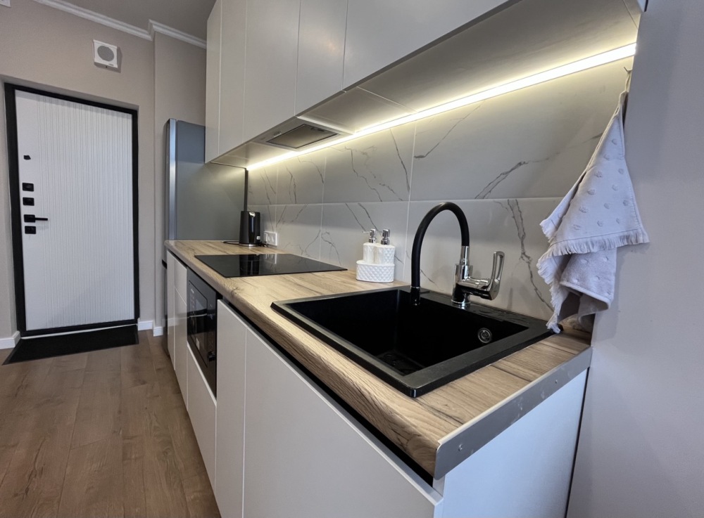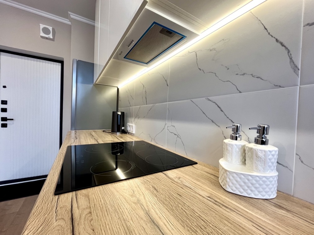 - Современная кухня с индукционной плитой, холодильником, посудой и всем необходимым для кулинарных экспериментов.