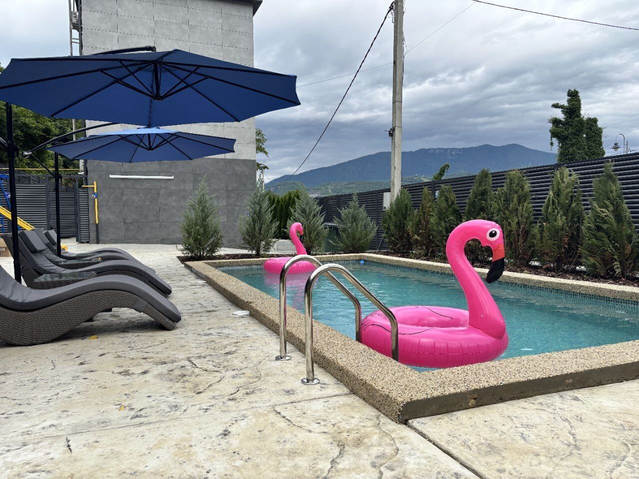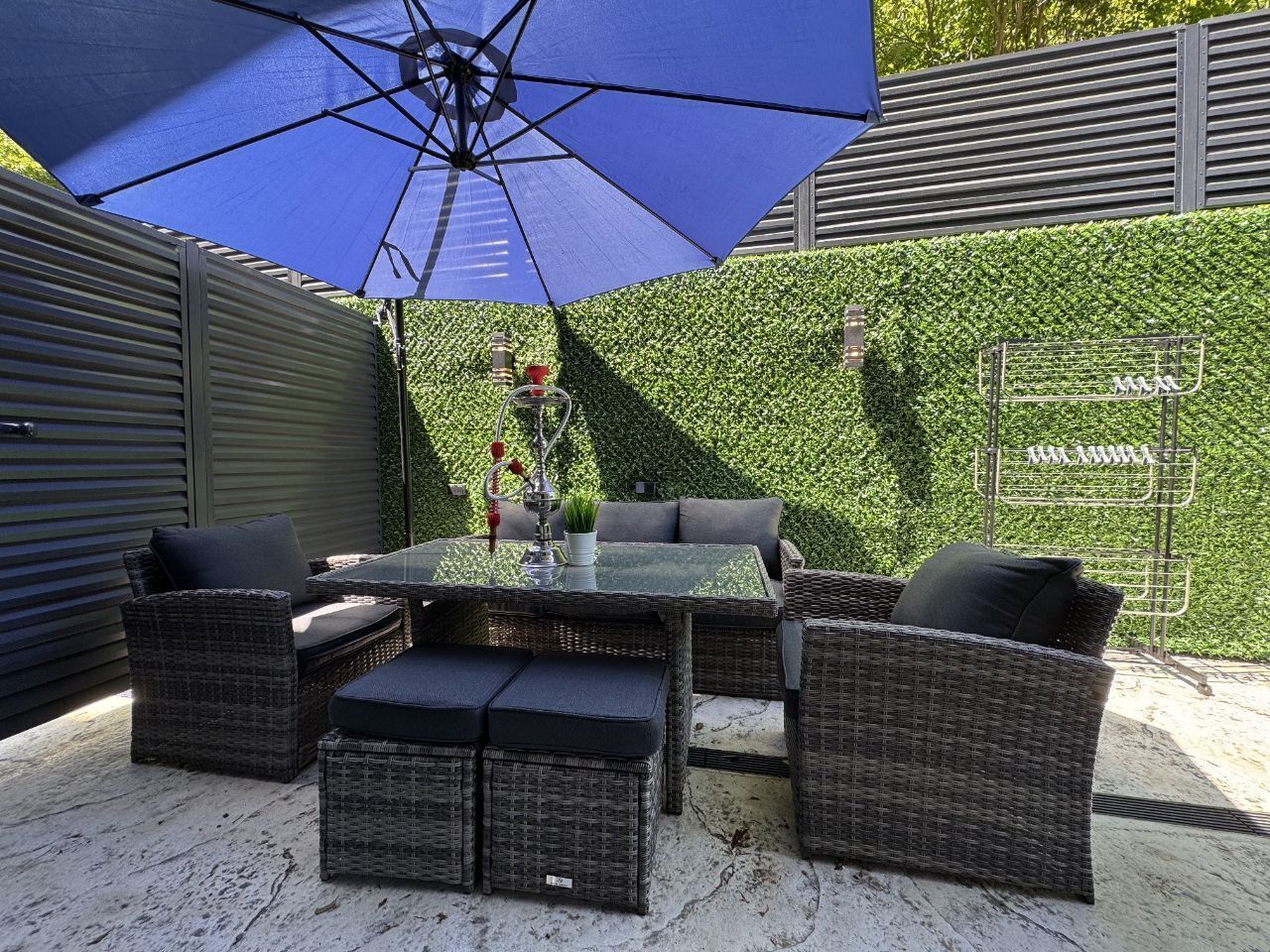 Зона отдыха- кальян, караоке- колонка, уличный проектор, бадминтон, дартс, качели, беседка.