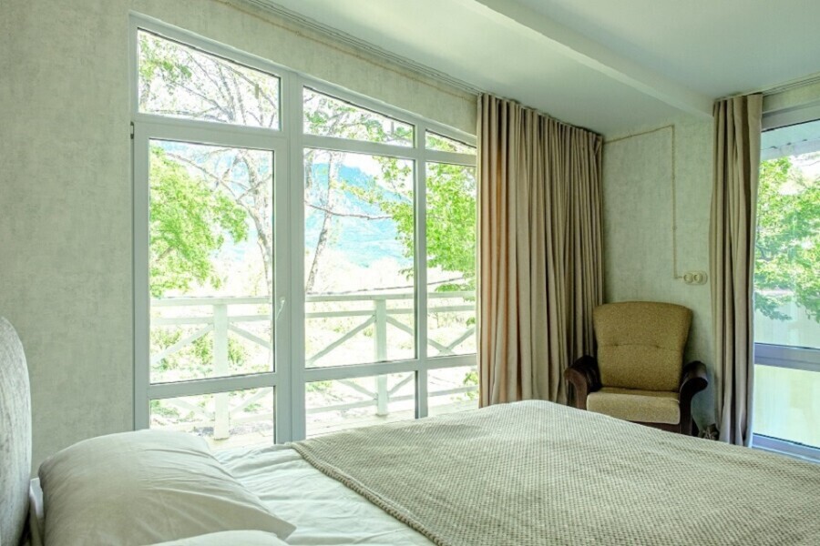 Конфигурация : Двухкомнатный домик с панорамным окном в спальне и выходом на просторную террасу в гущу дубового леса или на балкон с видом на гору Демерджи. Спальня оснащена двуспальной кроватью 160х200 см, креслом, прикроватной тумбой и столиком с выдвижными ящиками. Во второй комнате - двуспальная кровать 140х200, окно в видом на дубовый лес, столик, диван и телевизор 52 дюйма. В номере большой шкаф с зеркалом в полный рост. Ванная комната оснащена душем. Фен в каждом номере. Махровые халаты.