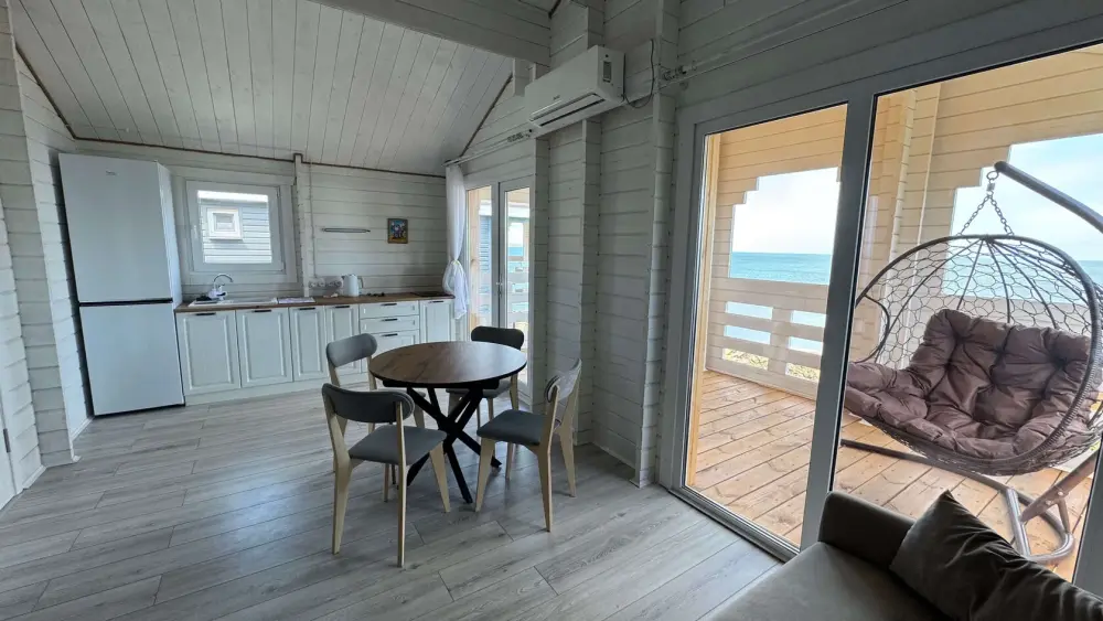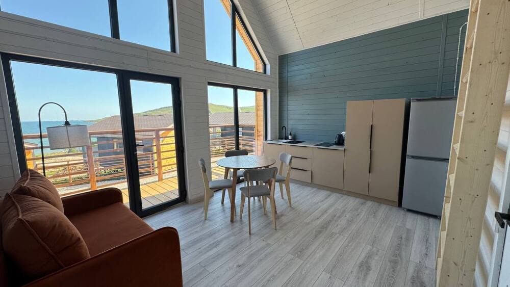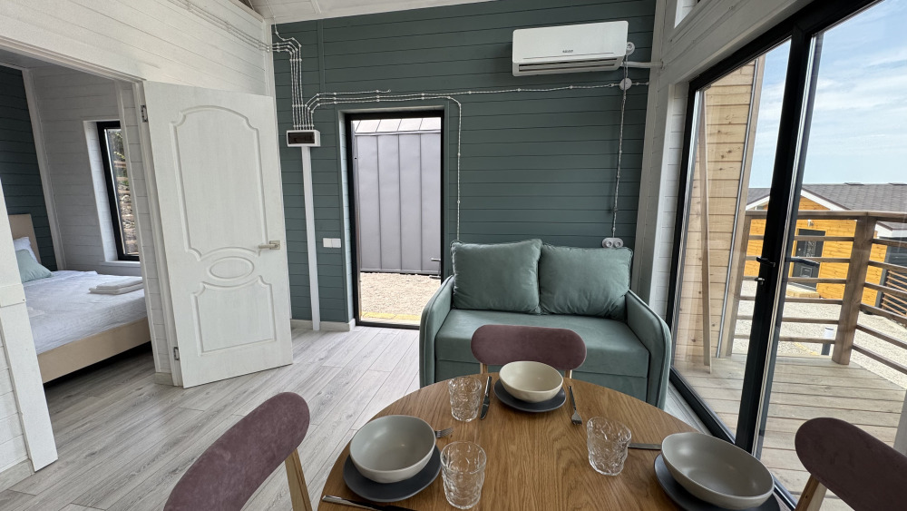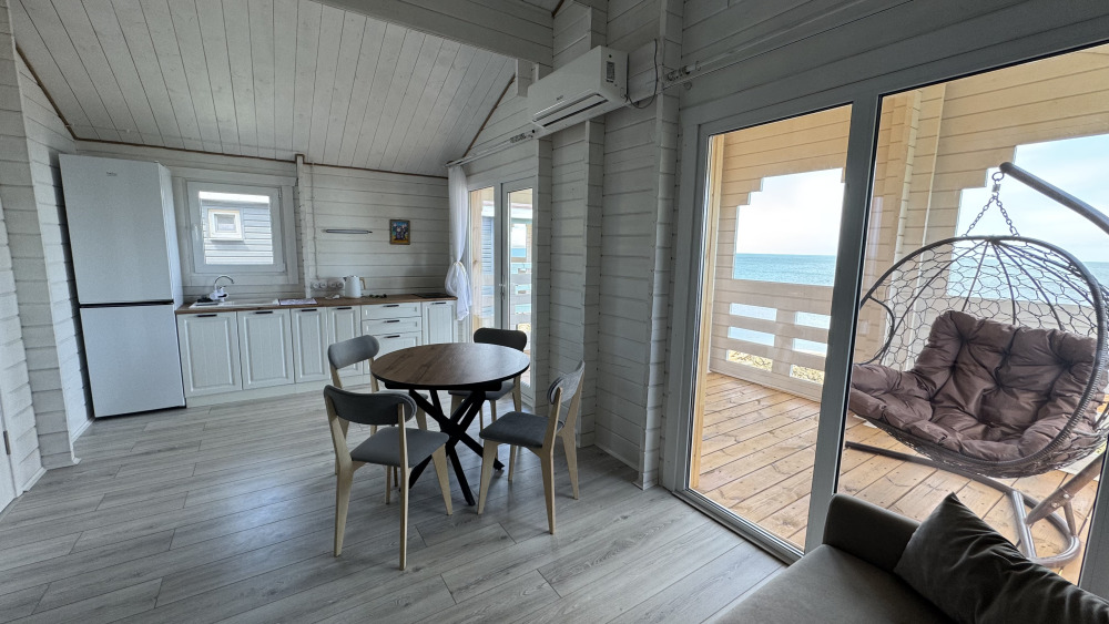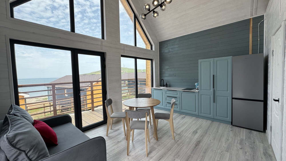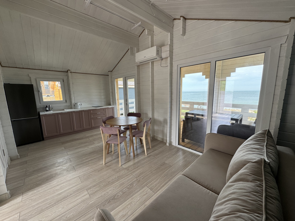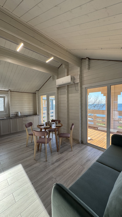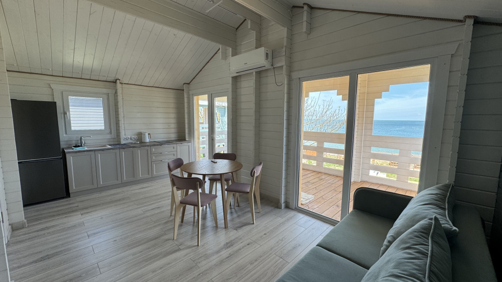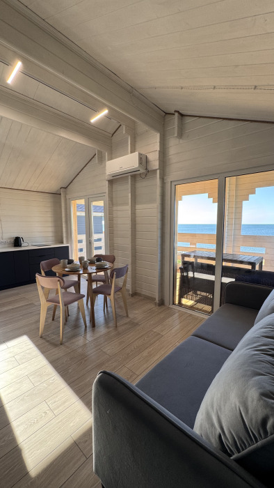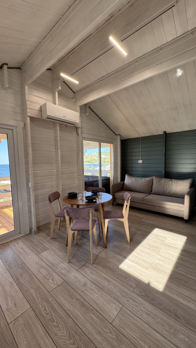 Современный дизайн, натуральное дерево и минимализм - интерьер напоминает, что Вы находитесь наедине с природой. Внутри расположена отдельная спальня, кухня-гостиная, душевая комната и собственная терраса с видом на море. Вместимость коттеджа до 4 человек: 2 основных спальных места на кровати и 2 дополнительных на большом двуспальном диване. Полная комплектация коттеджа сделает Ваш отдых комфортным: необходимая мебель, бытовая техника, посуда и кухонные приборы, а также комплекты белоснежных полотенец, халатов и косметических принадлежностей для каждого гостя.