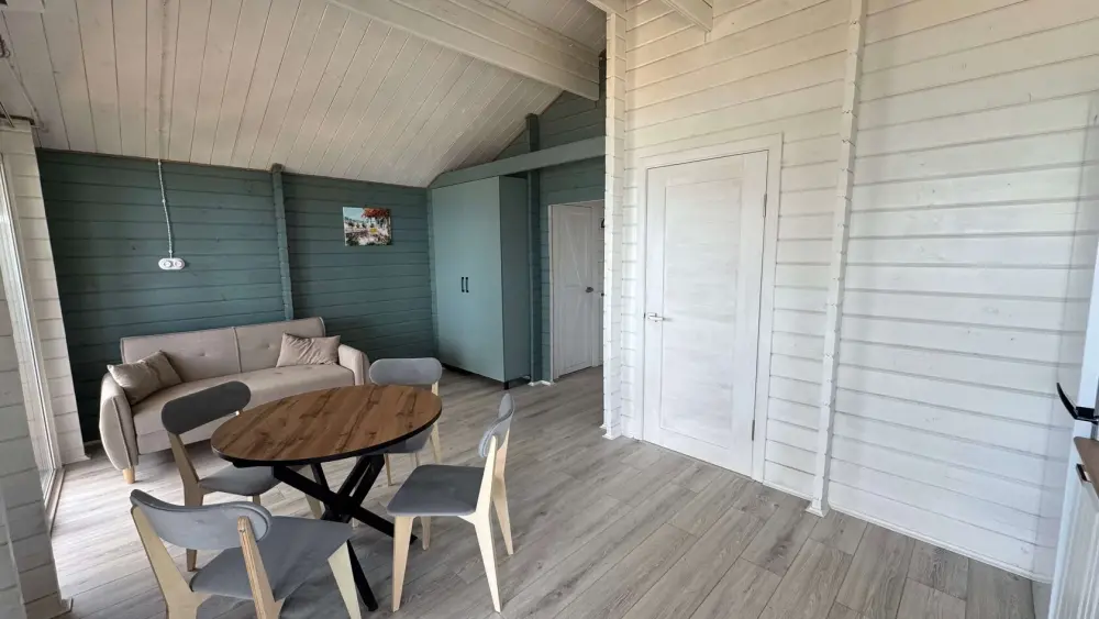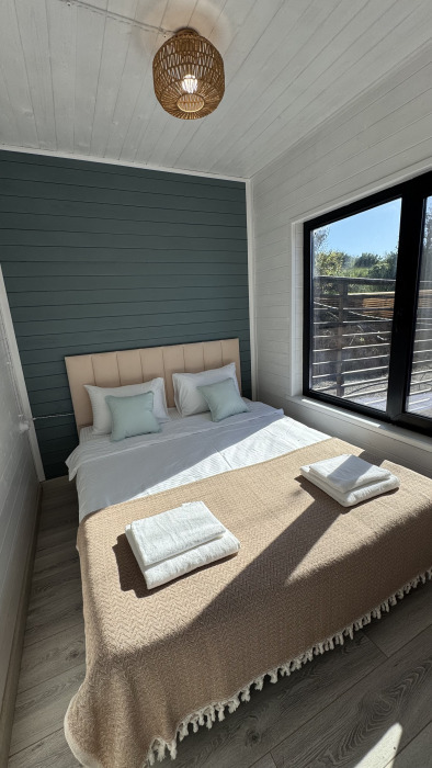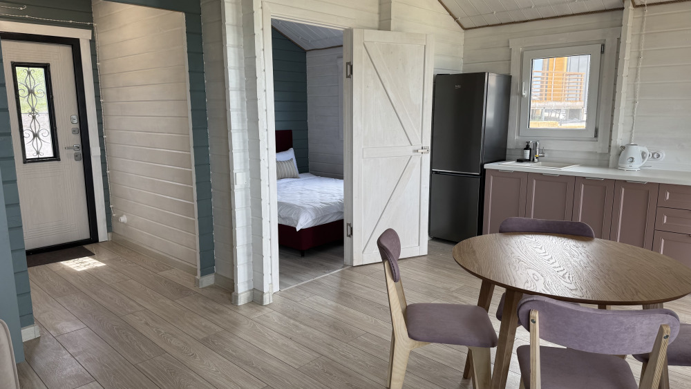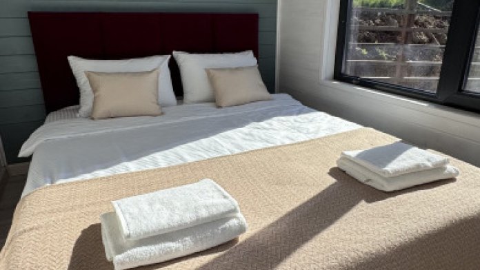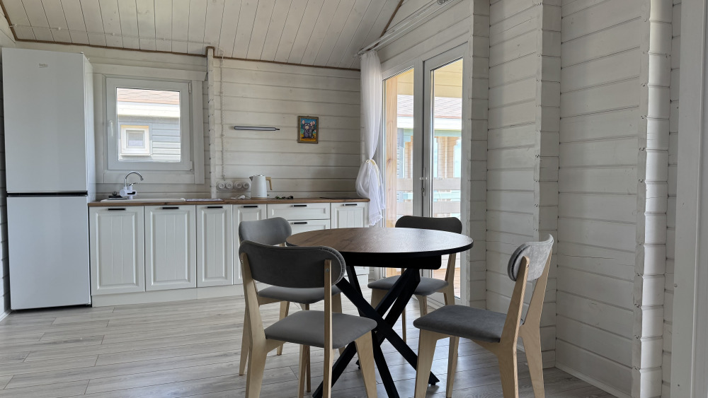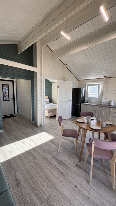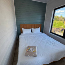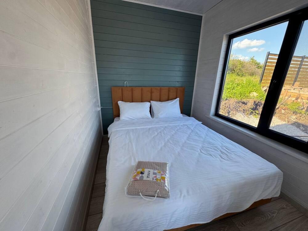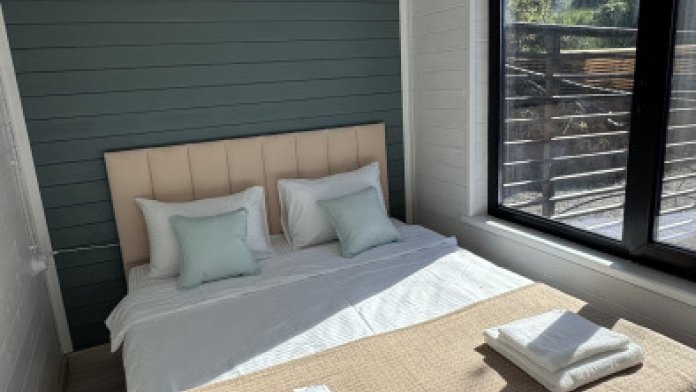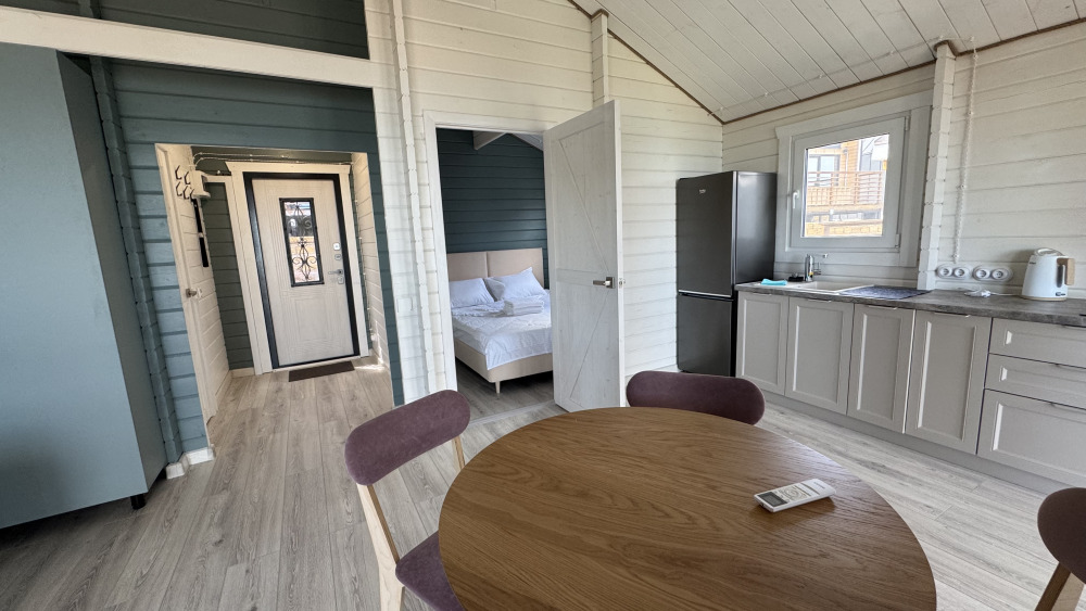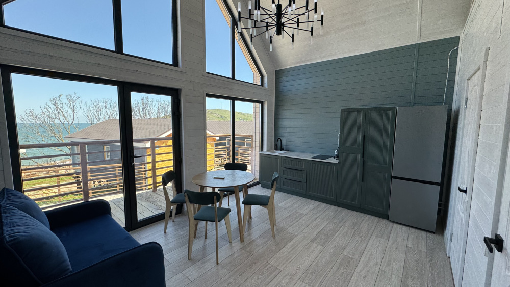 Современный дизайн, натуральное дерево и минимализм - интерьер напоминает, что Вы находитесь наедине с природой. Внутри расположена отдельная спальня, кухня-гостиная, душевая комната и собственная терраса с видом на море. Вместимость коттеджа до 4 человек: 2 основных спальных места на кровати и 2 дополнительных на большом двуспальном диване. Полная комплектация коттеджа сделает Ваш отдых комфортным: необходимая мебель, бытовая техника, посуда и кухонные приборы, а также комплекты белоснежных полотенец, халатов и косметических принадлежностей для каждого гостя.