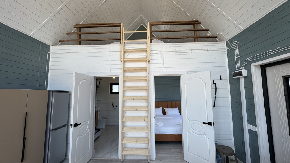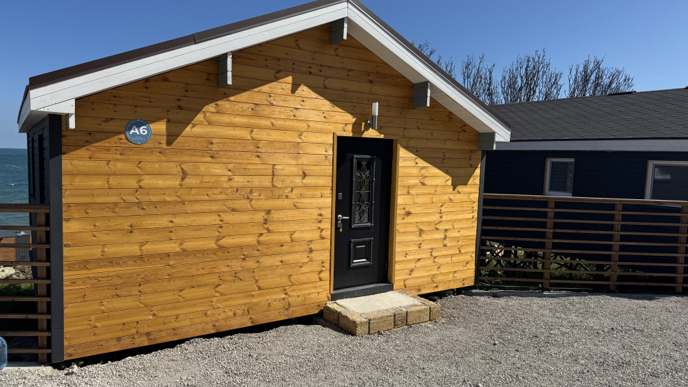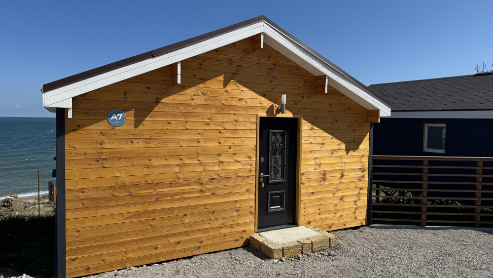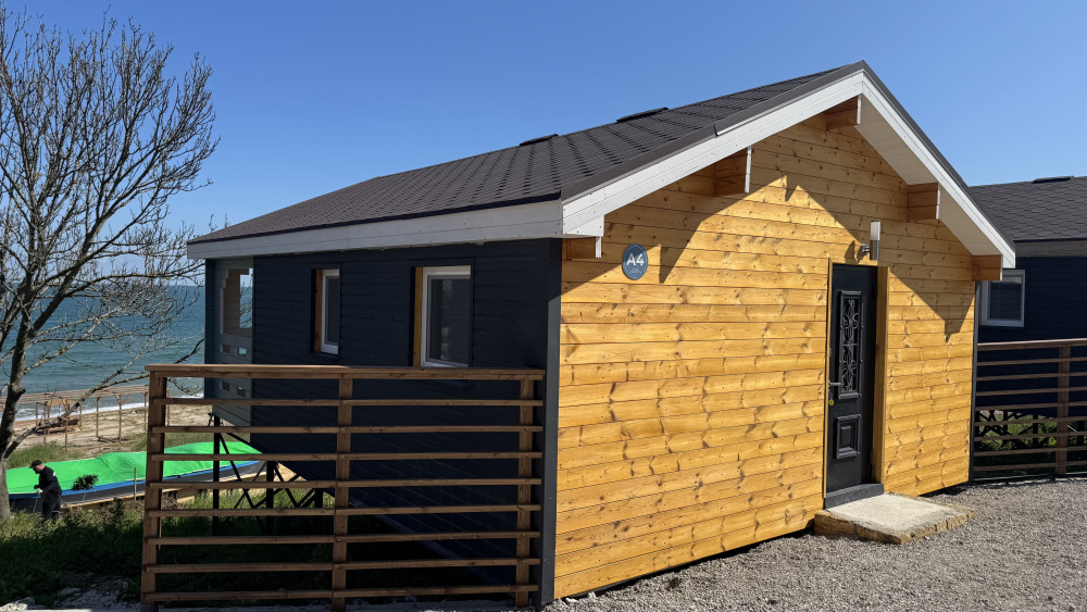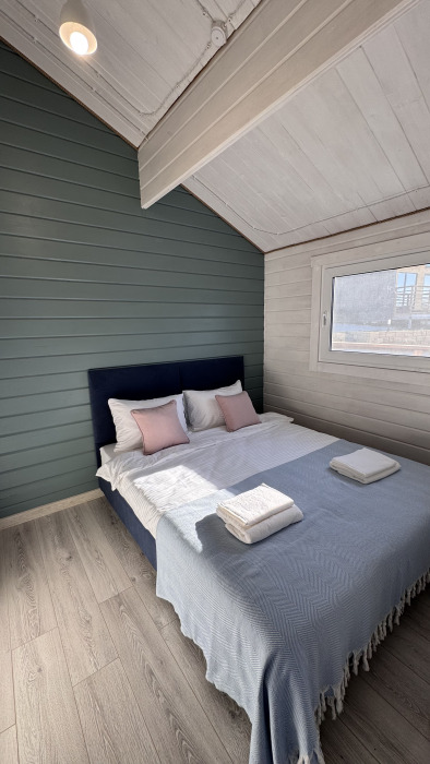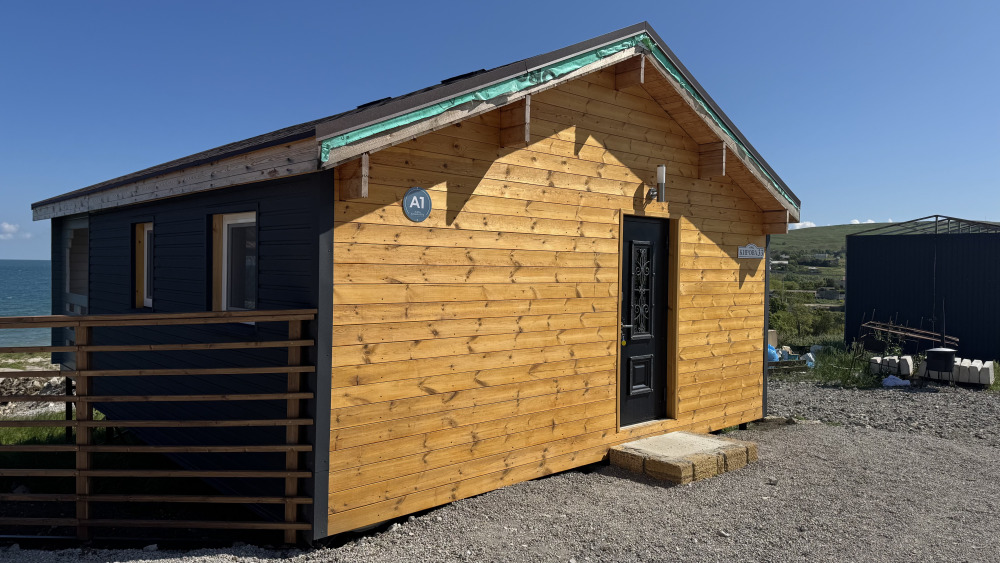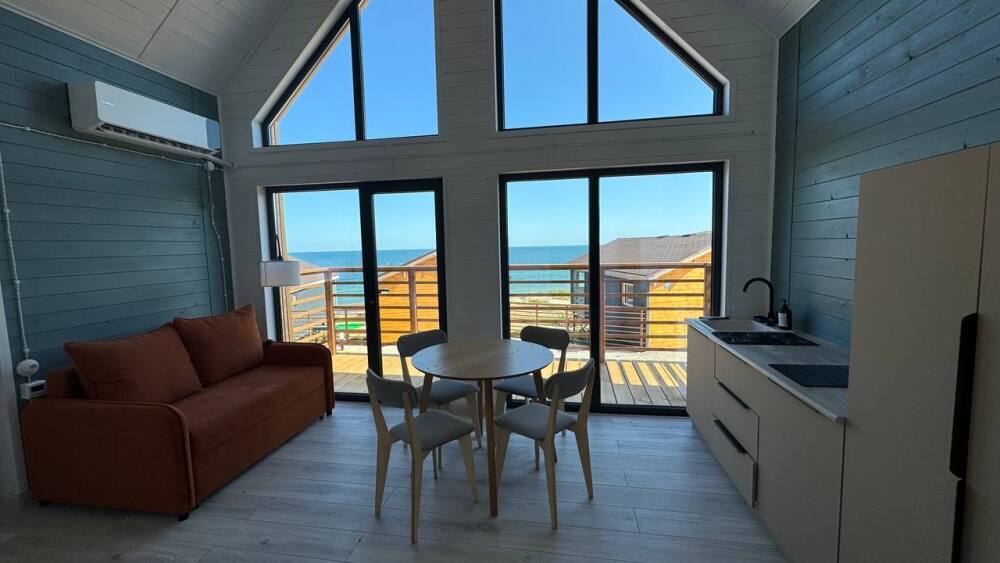 Коттедж в смелых морских оттенках выполнен из натурального дерева с отдельной спальней, кухней-гостиной и душевой комнатой, оборудован собственной террасой с видом на море.