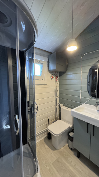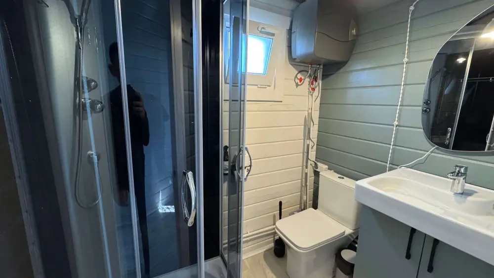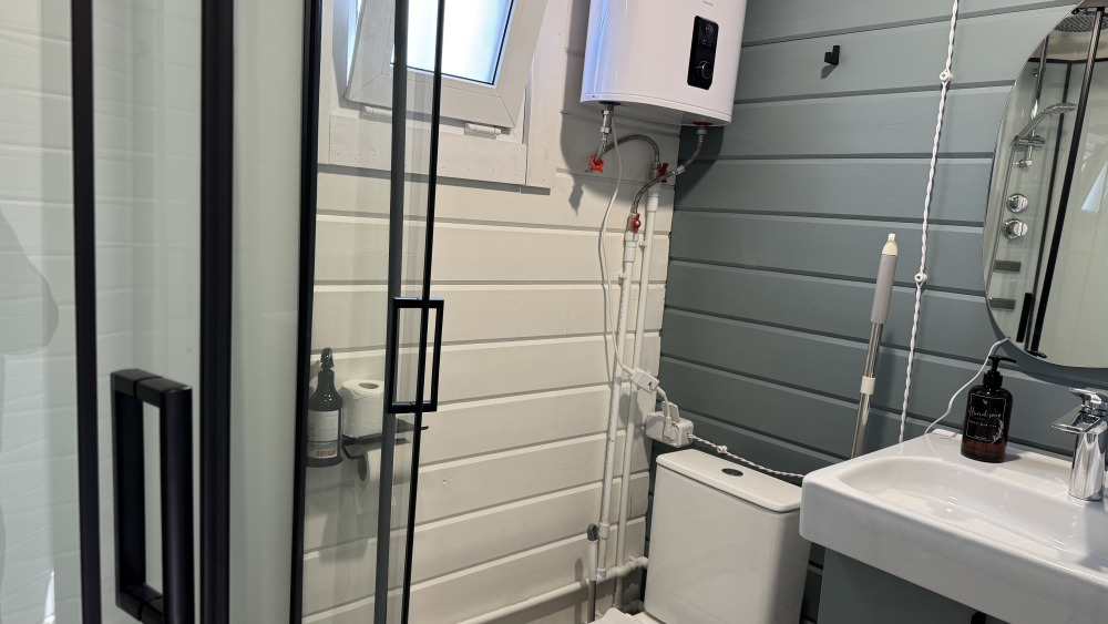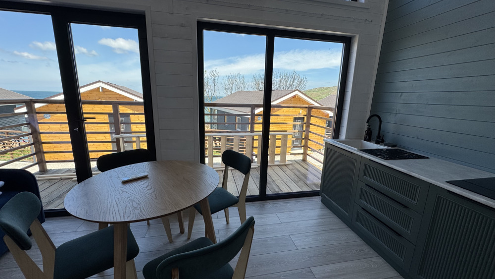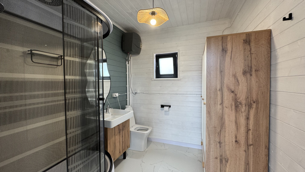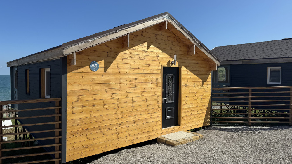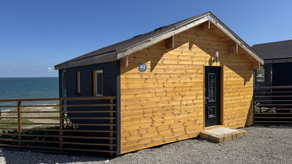 Коттедж в смелых морских оттенках выполнен из натурального дерева с отдельной спальней, кухней-гостиной и душевой комнатой, оборудован собственной террасой с видом на море.