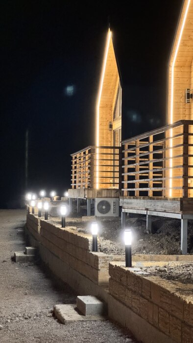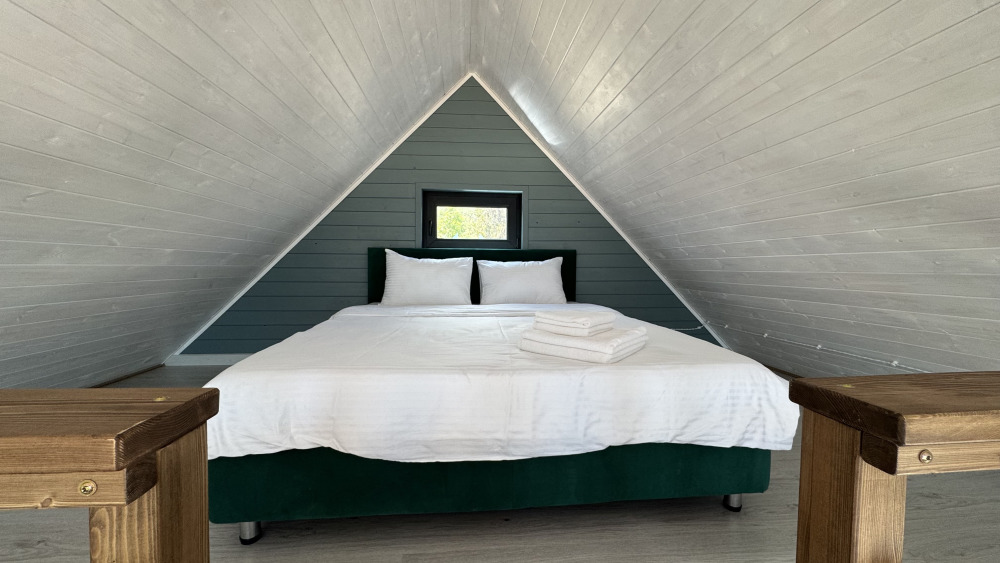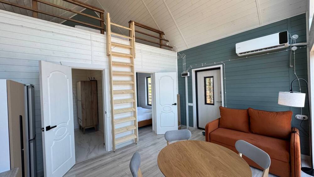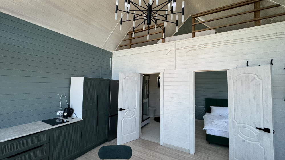 Коттедж в стиле А-фрейма со вторым светом выполнен в насыщенных песочных оттенках с отдельной спальней на 1 этаже, спальней со вторым светом на 2 этаже, кухней-гостиной, душевой комнатой и террасой.