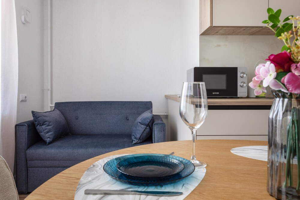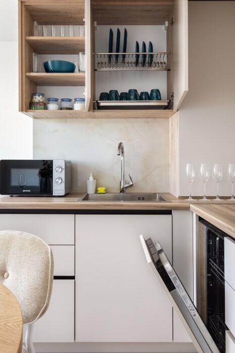 - Кухня оснащена: варочной панелью, свч-печью, электрочайником, холодильником, посудомоечной машиной.