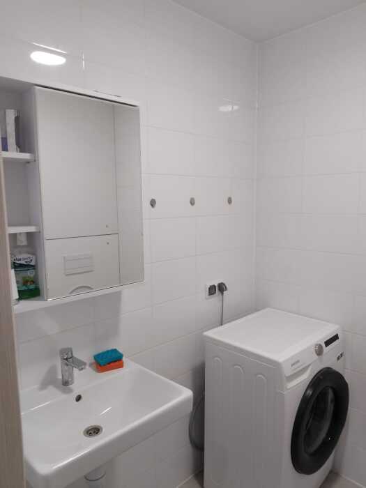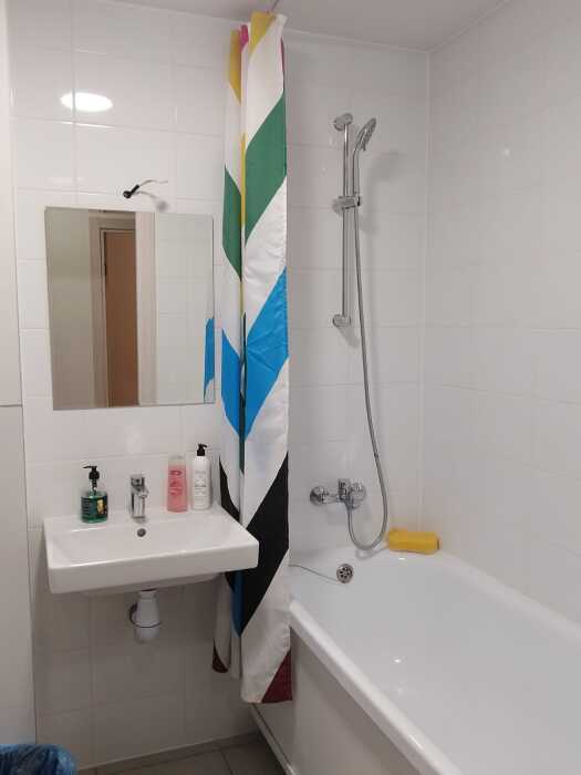 Ванная комната: ванная, стиральная машина, фен, мыло, гель для душа, стиральный порошок, туалетная бумага.