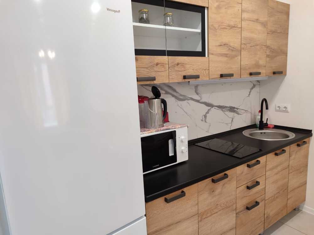 Кухня: электрическая плита, микроволновка, чайник, холодильник, набор посуды и все необходимые принадлежности для приготовления пищи, соль, специи, чай.