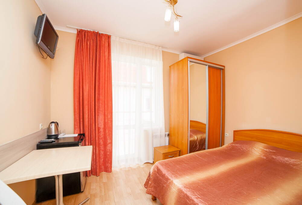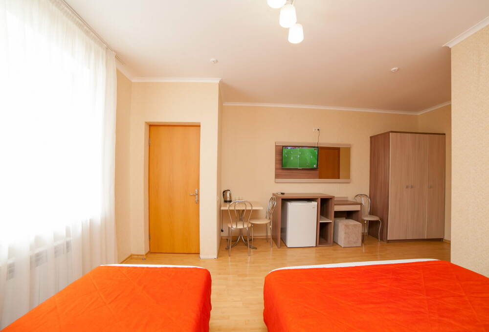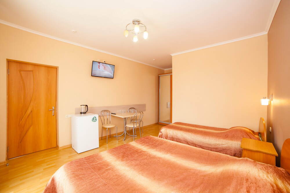 комфортабельный номер для 2 человек: в номере на выбор 1 двуспальная или 2 односпальные кровати с ортопедическими пружинными матрасами; также в номере 2 тумбочки, столик, 2 стула, шкаф-купе, сейф; смена полотенец и постельного белья