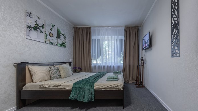 Новый ковролин во всей квартире, новый кухонный гарнитур, новая ванная комната. К Вашим удобствам качественное постельное белье 100% хлопок, мягкие махровые полотенца, а также средства гигиены. Стиральная машина, фен, утюг, сушилка для белья, новая посуда, фужеры, смарт тв. Широкая кровать (160*200) с ортопедическим матрасом, а также мега удобный раскладной диван (140*200).