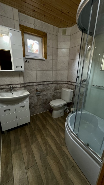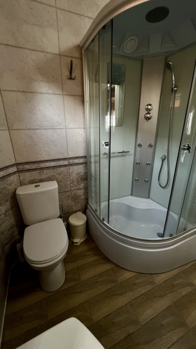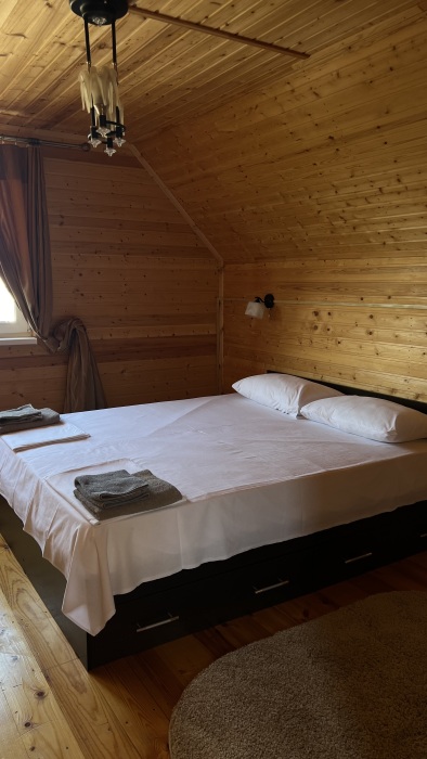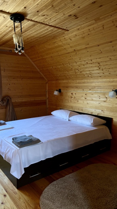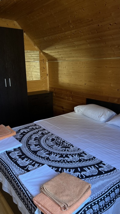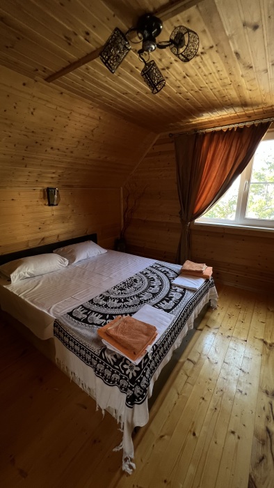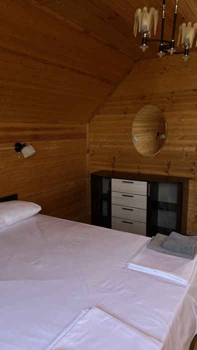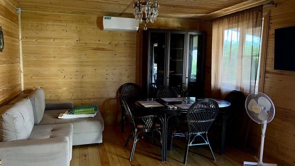 На первом этаже дома большая кухня гостиная с обеденной зоной из натурального ротанга, полноценная зона для готовки (варочная поверхность, холодильник с морозильной камерой, чайник, микроволновая печь, посуда). А так же диван, который превращается в спальное место. Телевизор смарт тв. Кондиционер. Санузел.