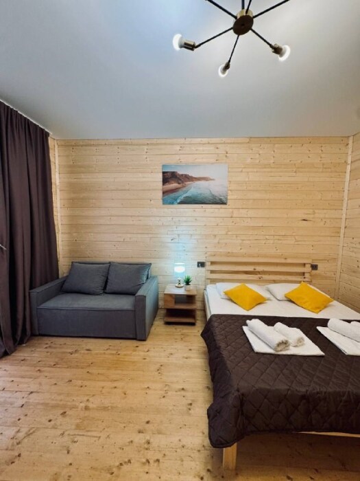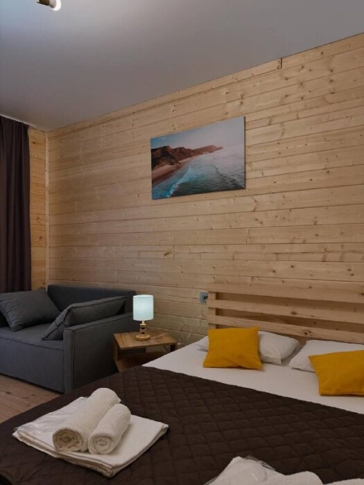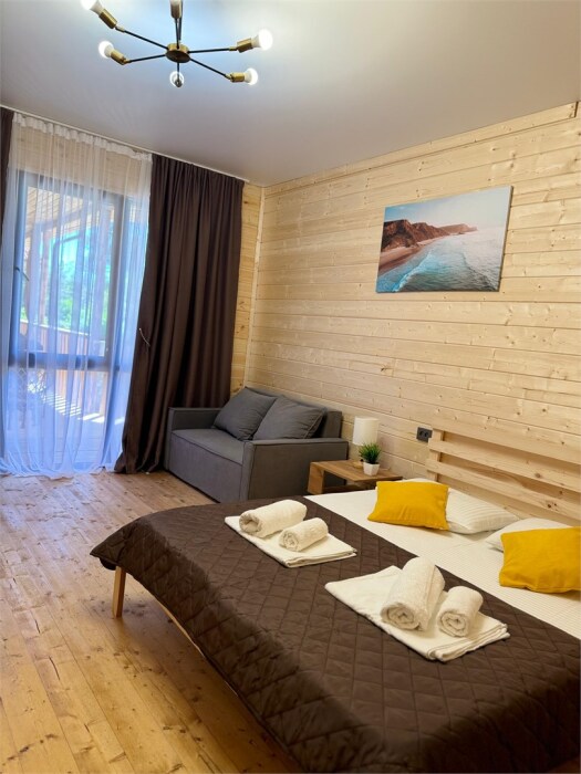 Панорамные окна, наличие большой кровати, диван-кровати.