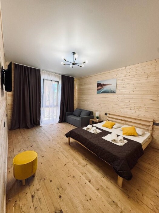 Панорамные окна, наличие большой двуспальной кровати и диван кровать.