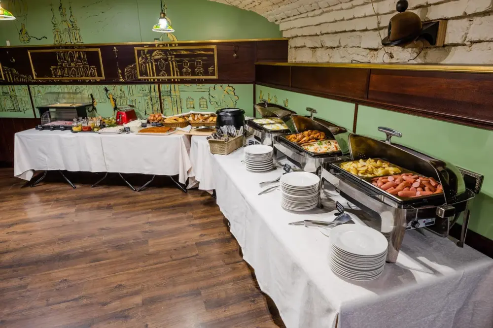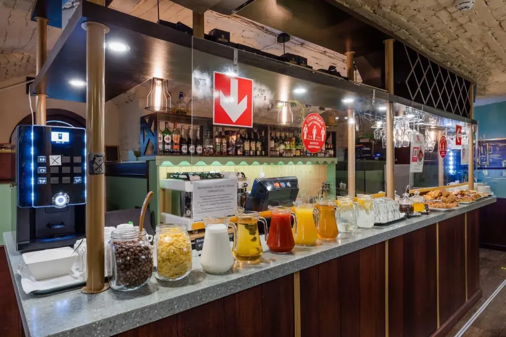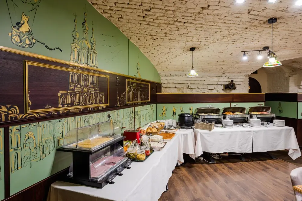 Каждое утро в ресторане, находящемся на территории отеля, проходит завтрак в формате «шведский стол». Там же можно пообедать сытным бизнес-ланчем и поужинать блюдами русской и европейской кухни.