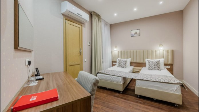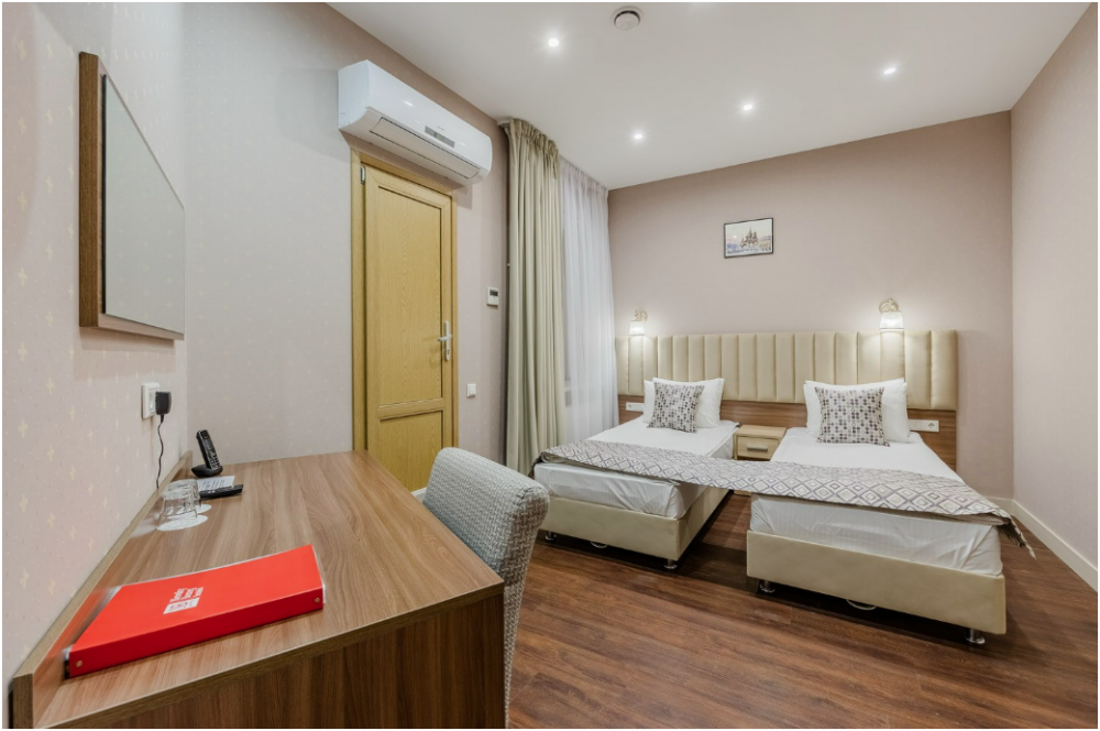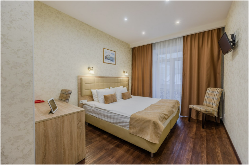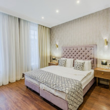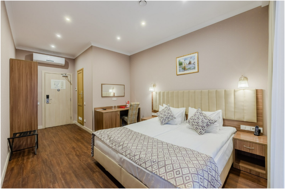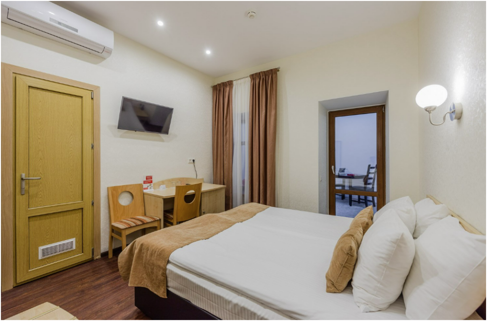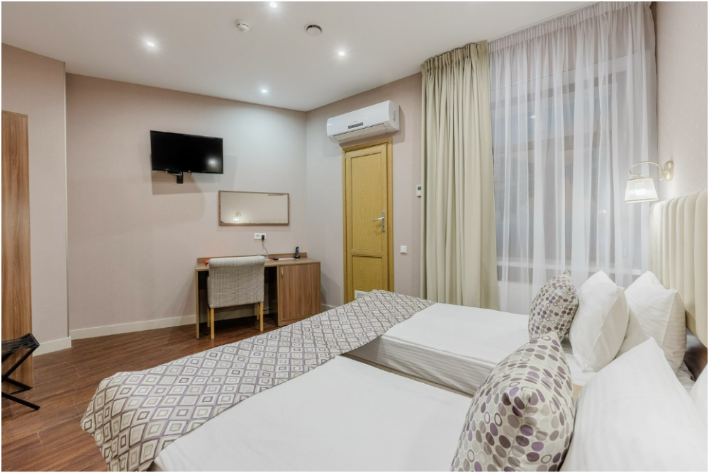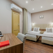 Уютные комнаты с двумя раздельными или двумя сдвинутыми кроватями. Площадь комнаты 16 м2 -20 м2. В каждой комнате, специально для Вашего удобного проживания в нашем отеле имеется: холодильник, телевизор, кондиционер в летнее время, тумбочка, стулья, шкаф, сейф, тумба для багажа и бесплатный доступ к сети Wi-Fi.