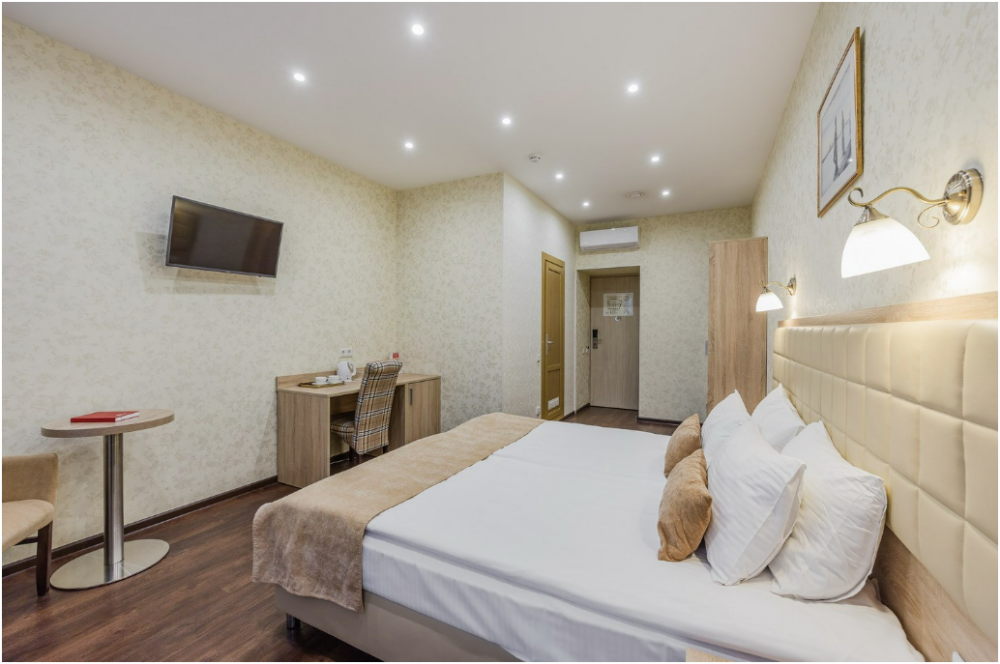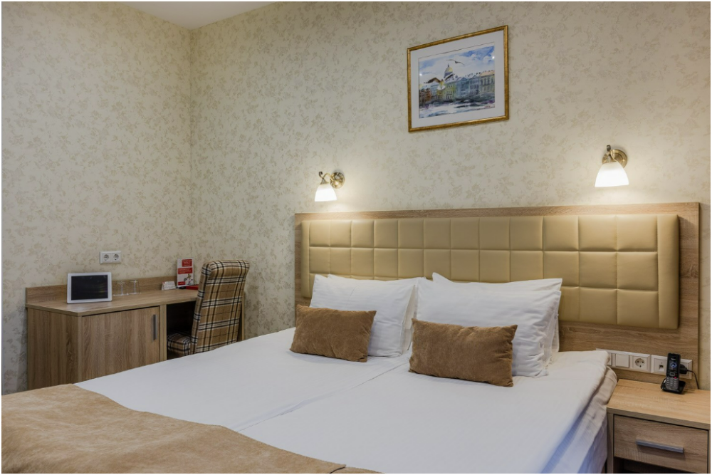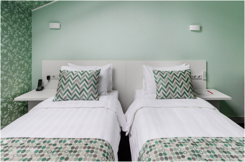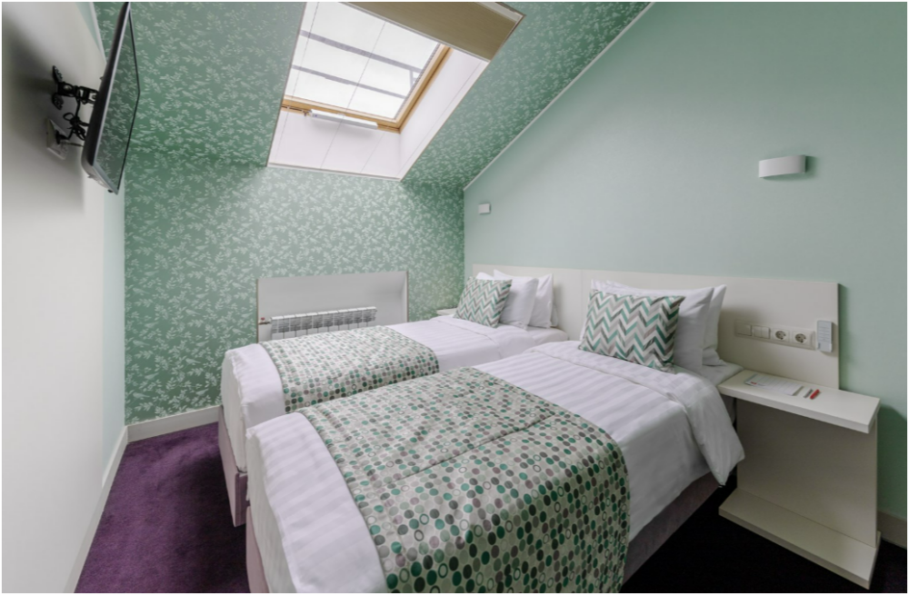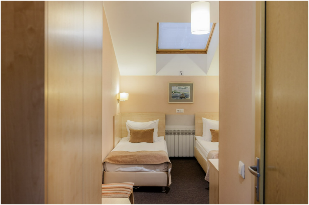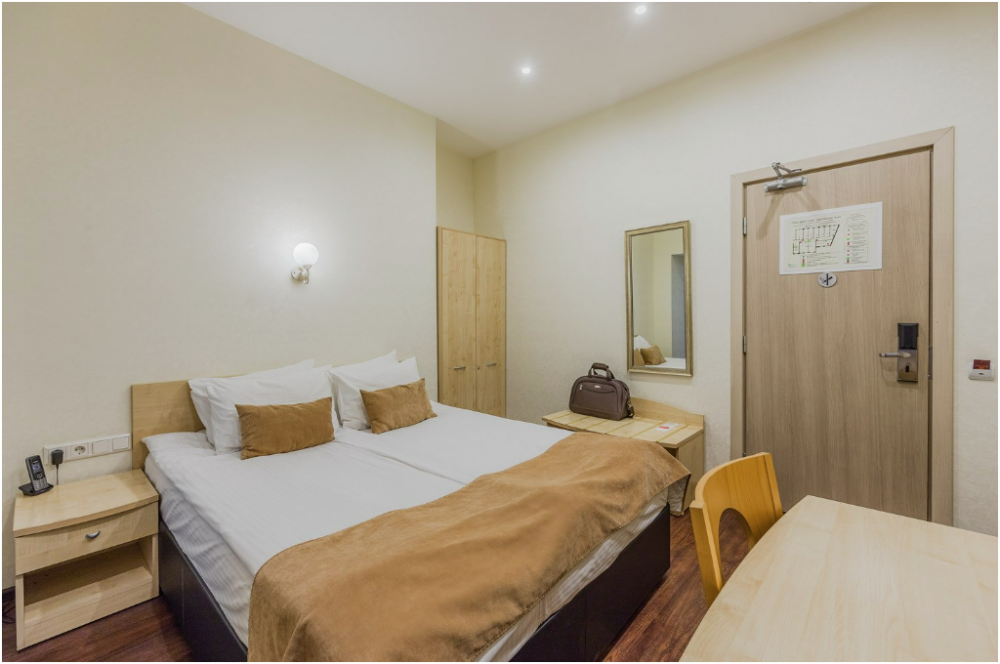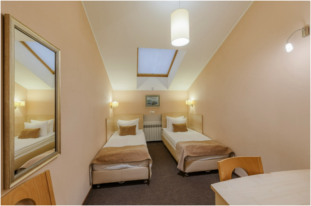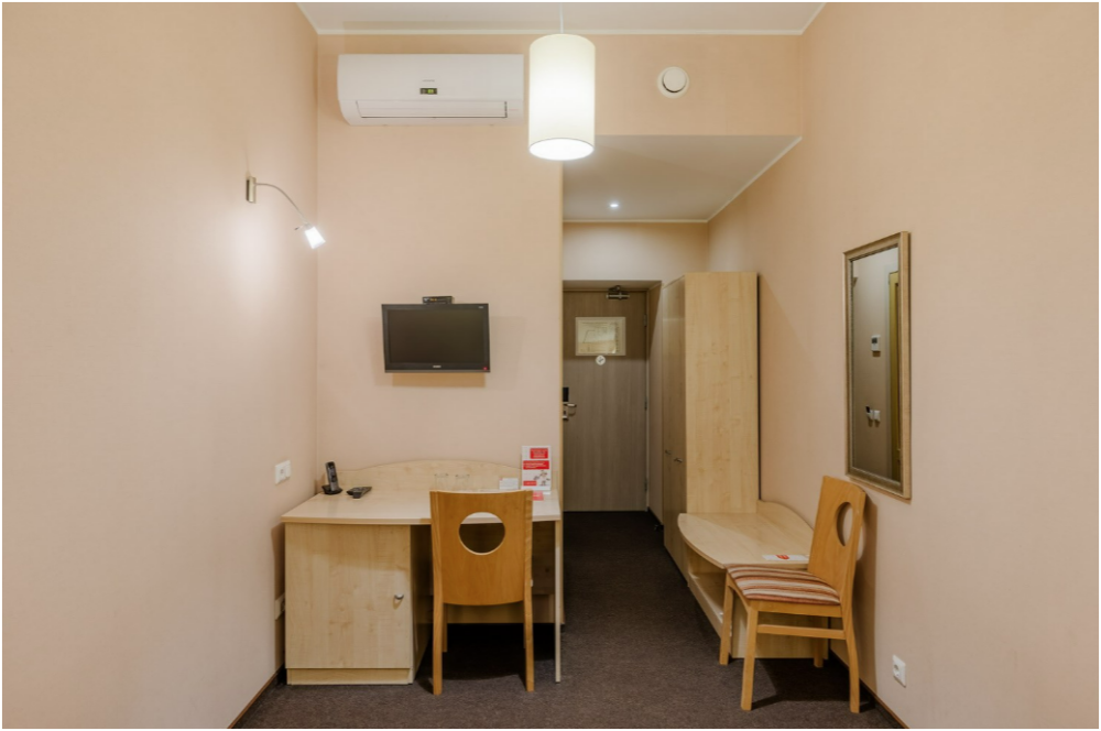 Уютные комнаты с двумя раздельными или двумя сдвинутыми кроватями. Площадь комнаты 12 м2 -15 м2. Номера располагаются преимущественно на четвертом и пятом этажах. На пятом этаже окна мансардные. В каждой комнате, специально для Вашего удобного проживания имеется: холодильник, телевизор, кондиционер, тумбочка, стулья, шкаф, тумба для багажа и бесплатный доступ к сети Wi-Fi.